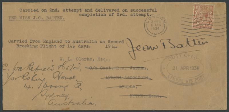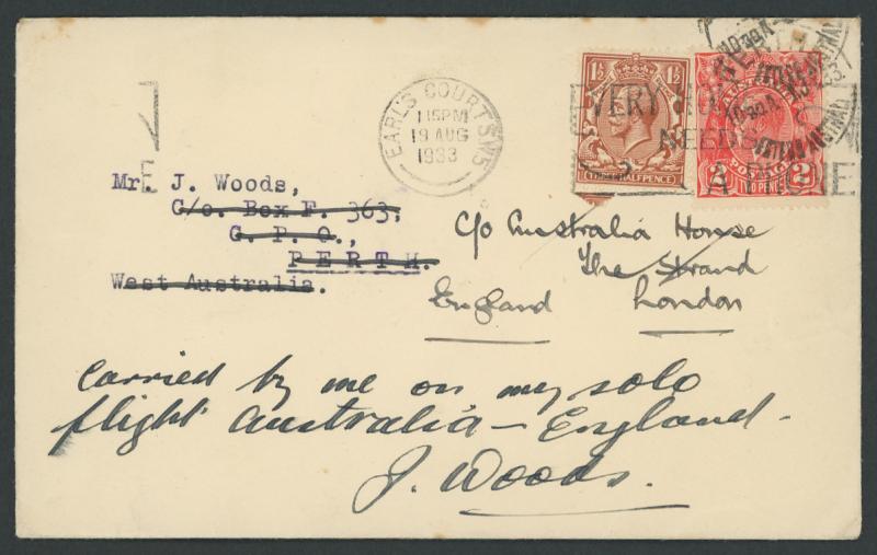 arrival & cancelled with 'EARLS COURT/19AUG/1933' slogan, endorsed "Carried by me on my solo flight ..." and signed "J Woods", minor blemishes, AAMC 316 (6 carried), undercatalogued at $600. Delayed by three forced landings, damage to propellor,