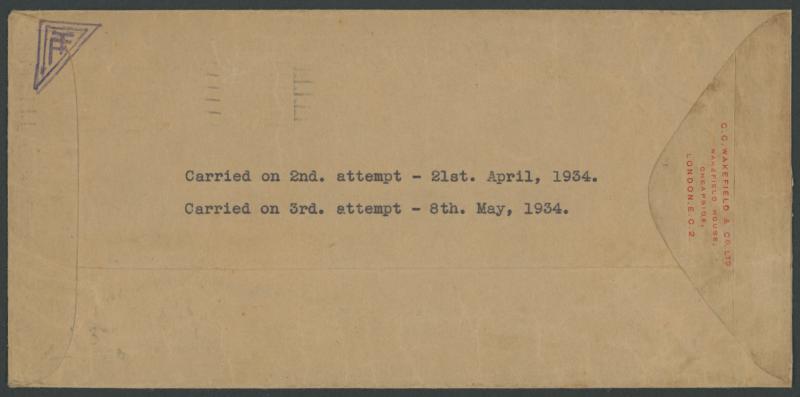 1933-34 CC Wakefield & Co envelope carried on the second & third of Jean Batten's flights from England, the first of them ending