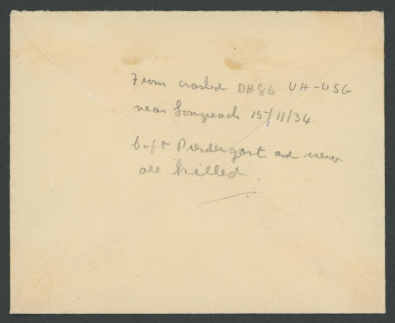 15.11.34/Capt Prendergast and crew all killed", a couple of hinge remnants otherwise superb. Unlisted in the AAMC. See Volume Two at pages 66-71: illustrated at pages 70-71 and stated to be the only recorded item from this fatal crash. This was the
