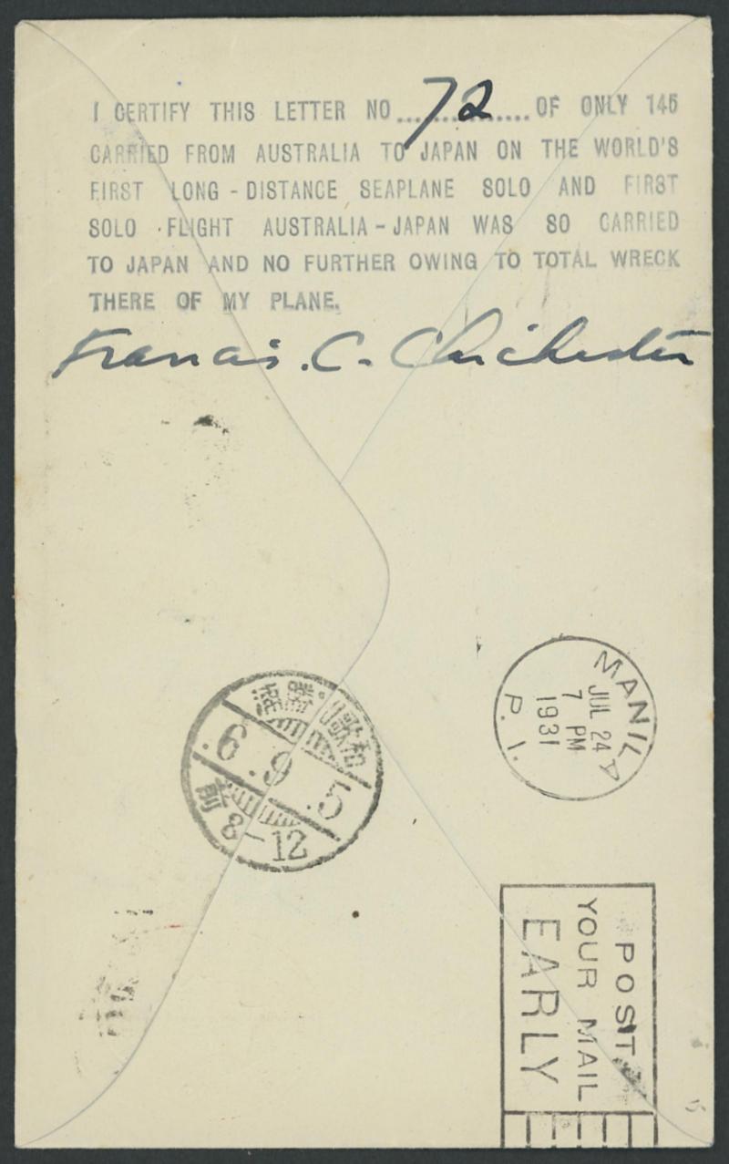 by 'THURSDAY ISLAND/ 2 /7JL31/QUEENSLAND', the reverse with Manila slogan of JUL24/1931, Japanese-language arrival & large cachet '...NO ("72") OF ONLY 145 CARRIED FROM AUSTRALIA...' signed by the pilot "Francis C Chichester", AAMC 210, Cat $525. See