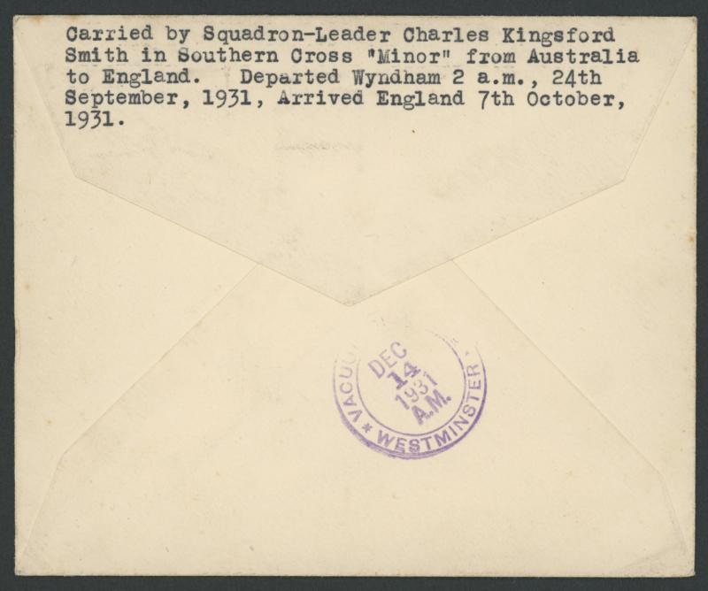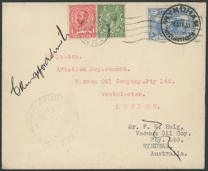 tied by superb 'WYNDHAM/WESTN AUSTRALIA' cds, Great Britain KGV ½d green & 1d red tied by London machine of OCT7/1931, signed "C Kingsford Smith", American-pattern 'VACUUM OIL CO/DEC/14/1931/AM/WESTMINSTER' private backstamp in violet, AAMC 215,