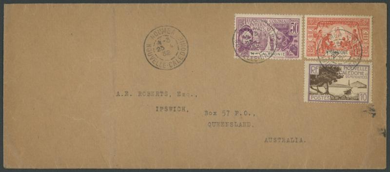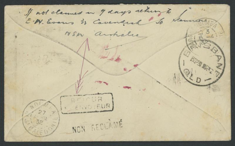 Brisbane cds of 30MR32, the reverse with very fine strike, 'NOUMEA/6-4/32/...' arrival & unframed 'NON RECLAME' (= unclaimed), the face with boxed 'PARTI SANS/RISSER d'ADDRESSE' (= left without a forwarding address) & boxed 'RETOUR/A L'ENVOYEUR' (=