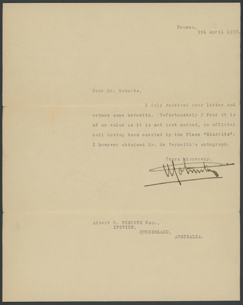 1932 (Apr 5) Australia-New Caledonia per French aviators Charles de Verneilh, Emile Munch and Max Deve with KSmith 6d tied by poor