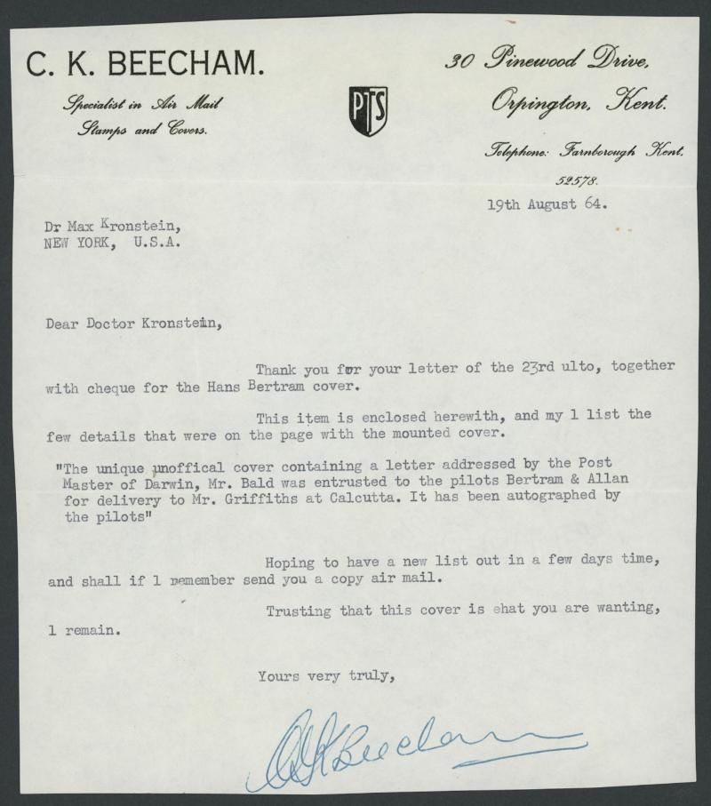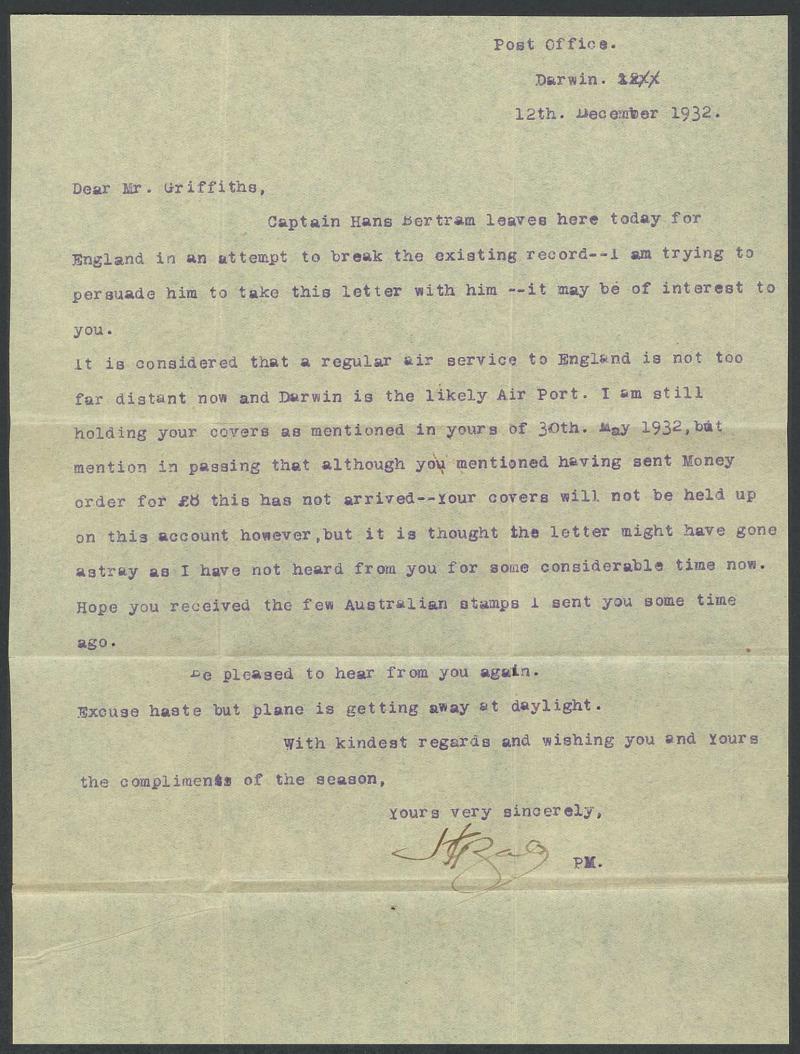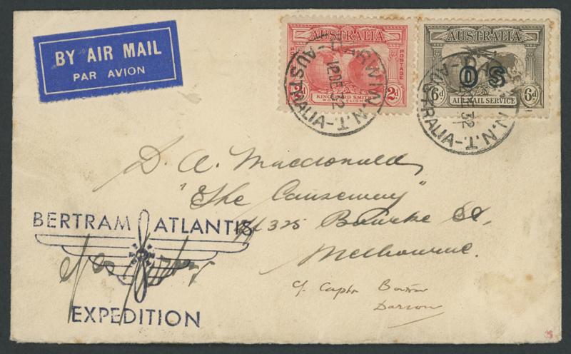 NT/AUSTRALIA' cds, signed "Hans Bertram", light staining & small fault at upper-left, AAMC 241a ("1 known"), Cat $1750. Plus the enclosed letter from the Darwin Postmaster "HG Bald", reminding the addressee that a promised money order for £8 (a
