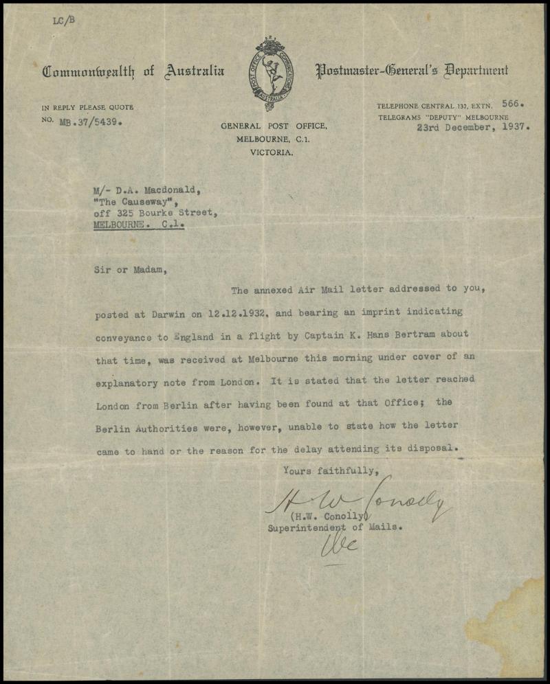 Following repairs to his plane, Bertram flew to Berlin, arriving 17.4.1933. The 20 or so covers were discovered at the Berlin GPO in -.12.1937 & forwarded to London (superb backstamp of 8DE/37), flown to Australia per Imperial Airways flying boat ex