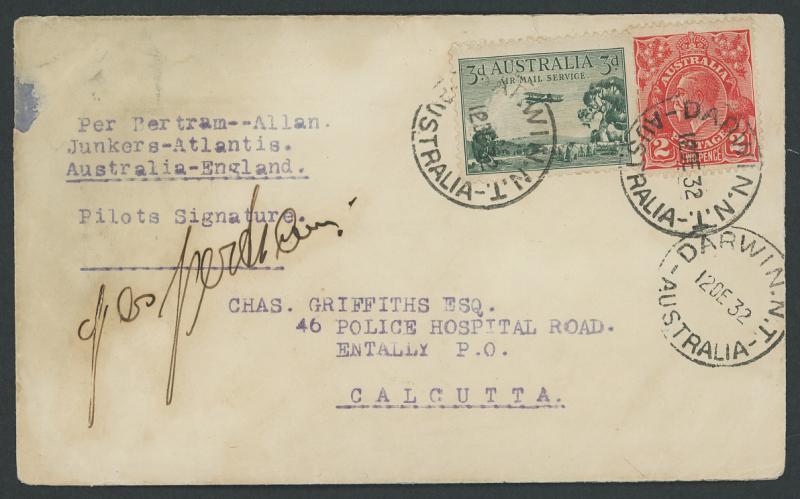 1932 (Dec 12) cover endorsed "Per Bertram-Allan/Junkers Atlantis/..." to Calcutta with KGV 2d & 3d Air tied by 'DARWIN