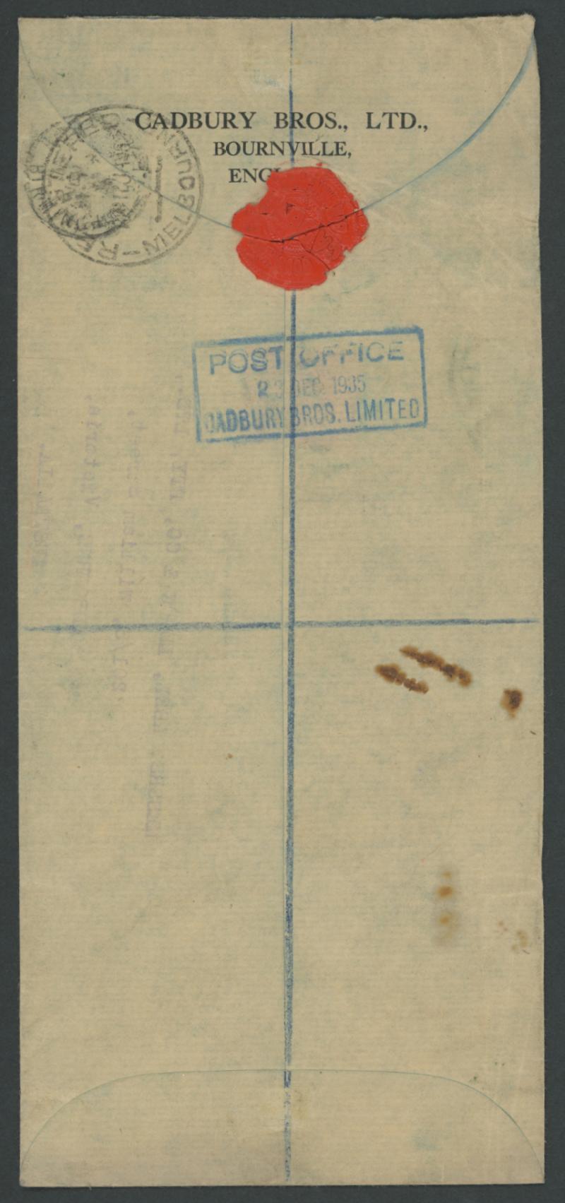 1935 (Dec) cover from Great Britain with 'CADBURY BROS LTD' imprint on the flap, boxed 'POST OFFICE/23DEC1935/CADBURY BROS