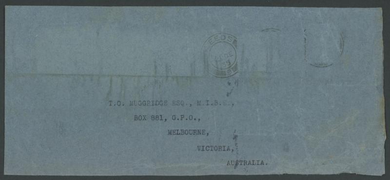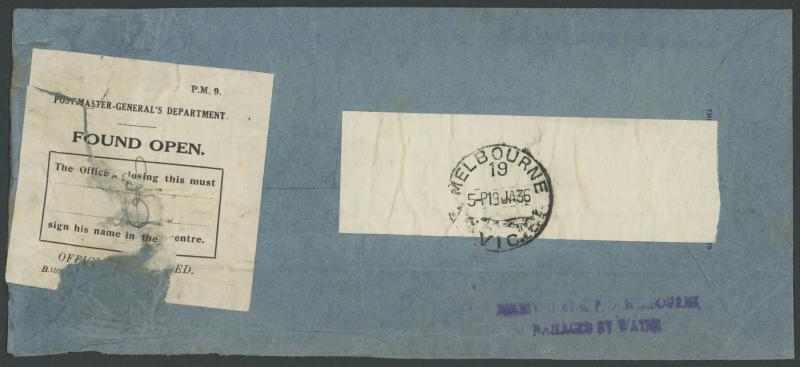 approach to Alexandria, to Melbourne with all stamps washed-off, resealed with a plain piece of paper tied by Melbourne cds and a '.../FOUND OPEN/...' label damaged on opening & crudely repaired, almost fine 'RECEIVED AT GPO MELBOURNE/DAMAGED BY