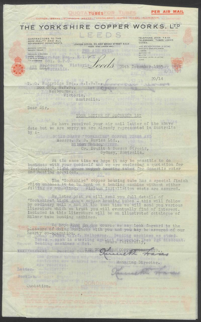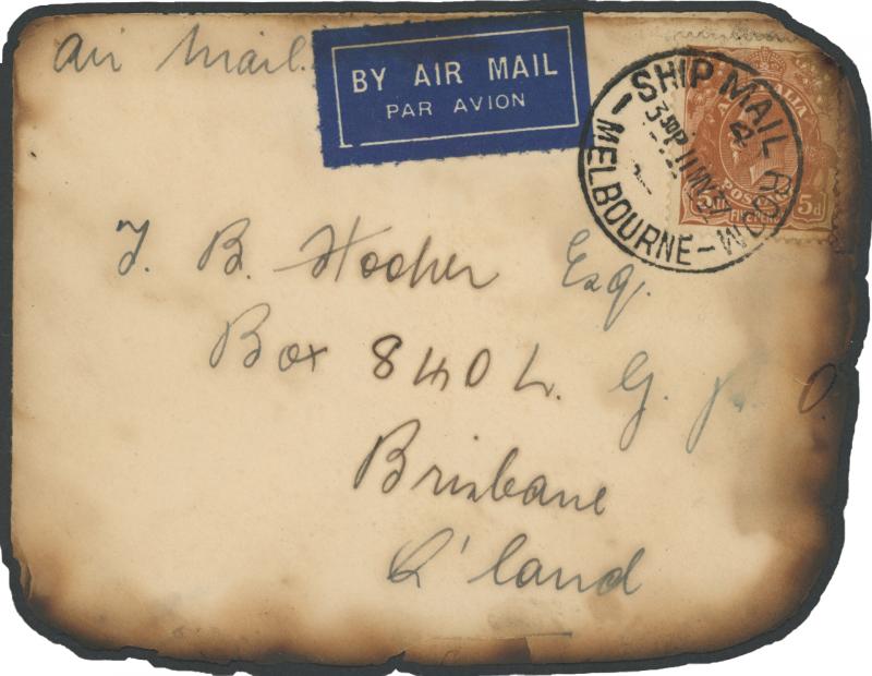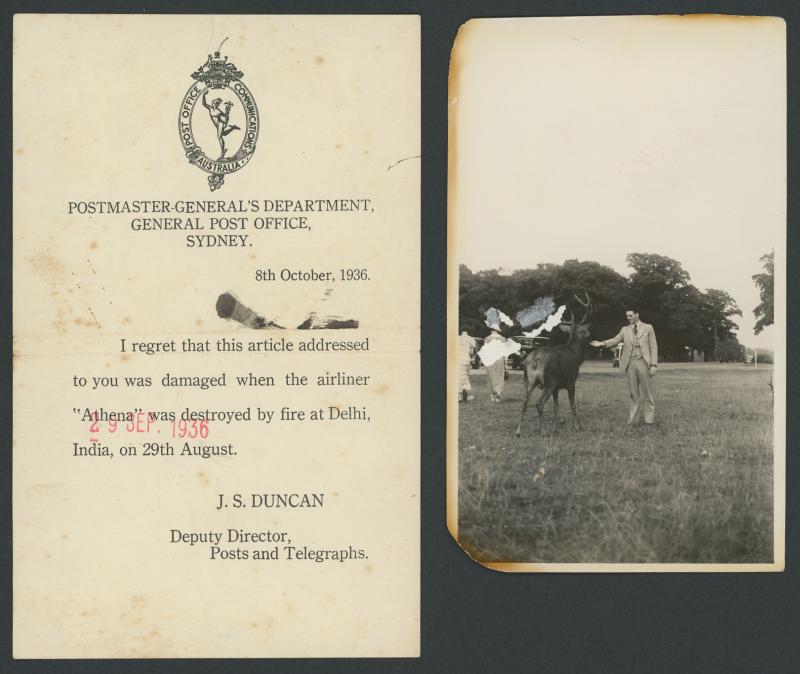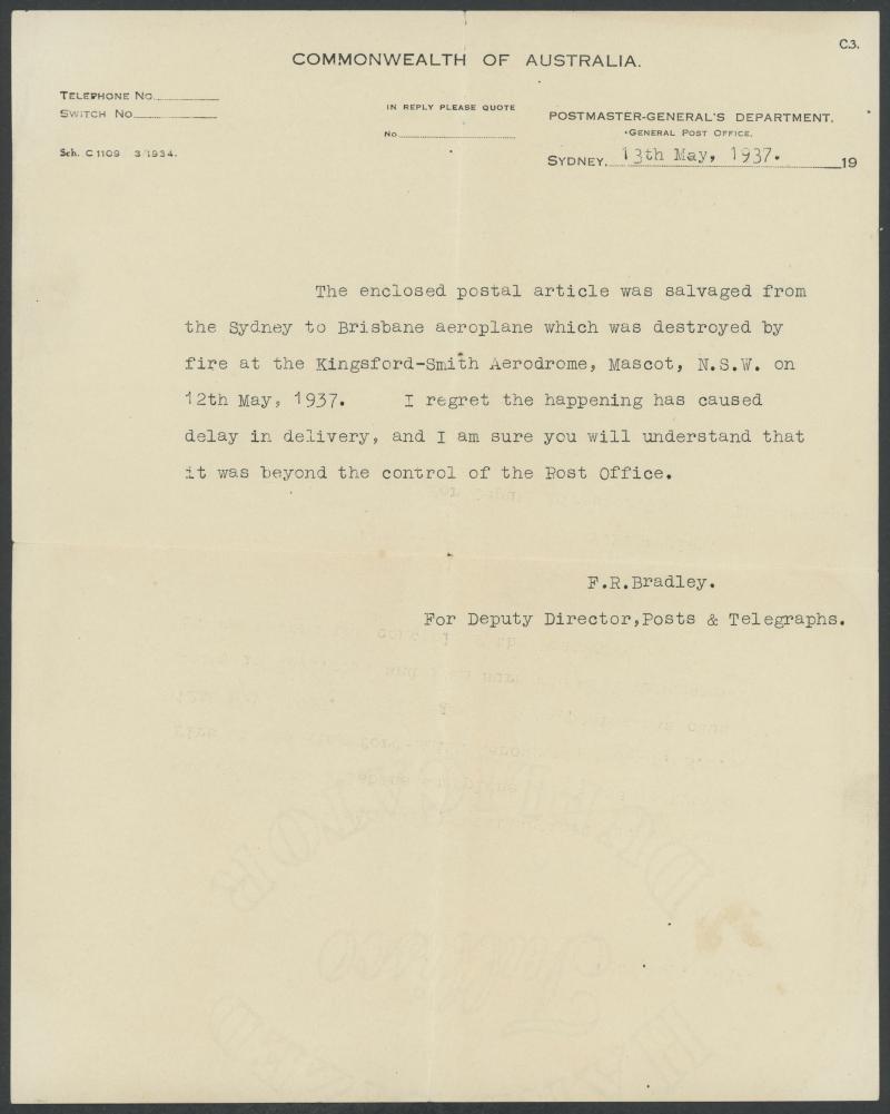 (minor bends) and PMG's Department explanatory letter that states "... salvaged from the Sydney to Brisbane aeroplane which was destroyed by fire at the Kingsford-Smith Aerodrome, Mascot, NSW on 12th May 1937". The pilot Peter Hoskins and three