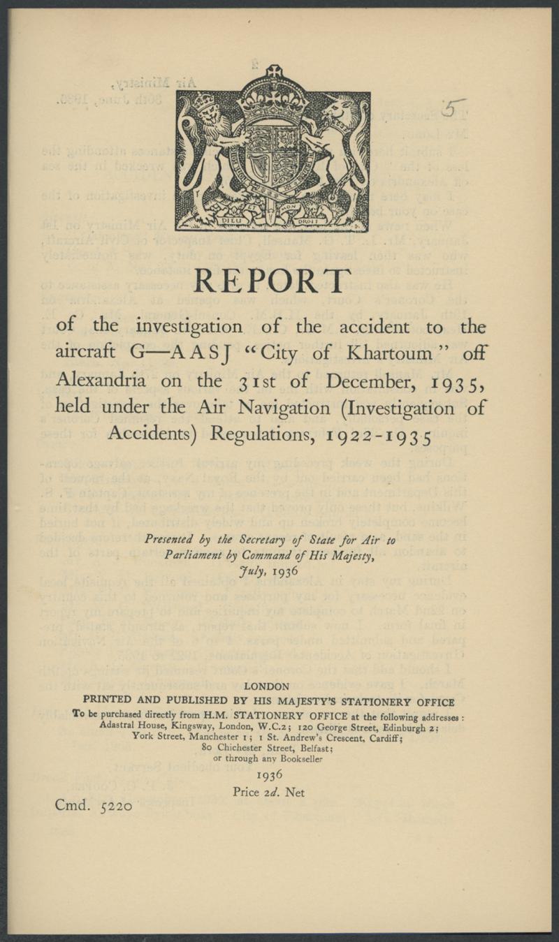 1935 'REPORT/of the investigation of the accident to the aircraft...City of Khartoum...' (July 1936) entire 12pp document in