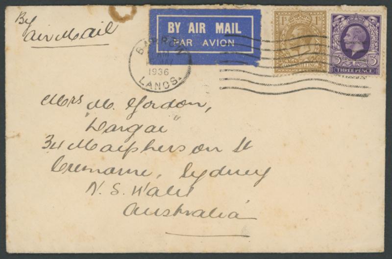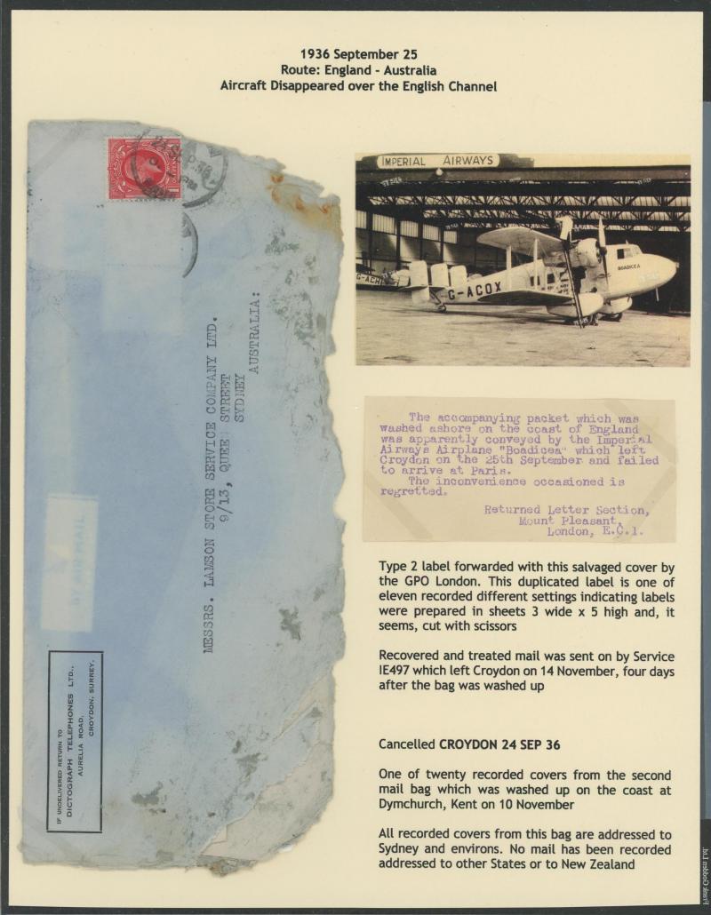 1936 (Sep 23) England-Australia per 'Boadicea' which was operating an emergency supplementary service to Paris & Brindisi but