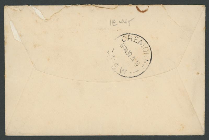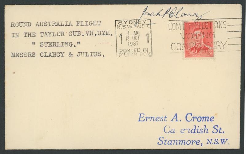 "Jack P Clancy", AAMC 746 (15 carried), undercatalogued at $200. See Volume Three at pages 26-29. The first attempt was abandoned after a crash at Old Bar (NSW). The second attempt departed 3.9.1937 & was relatively uneventful until engine trouble