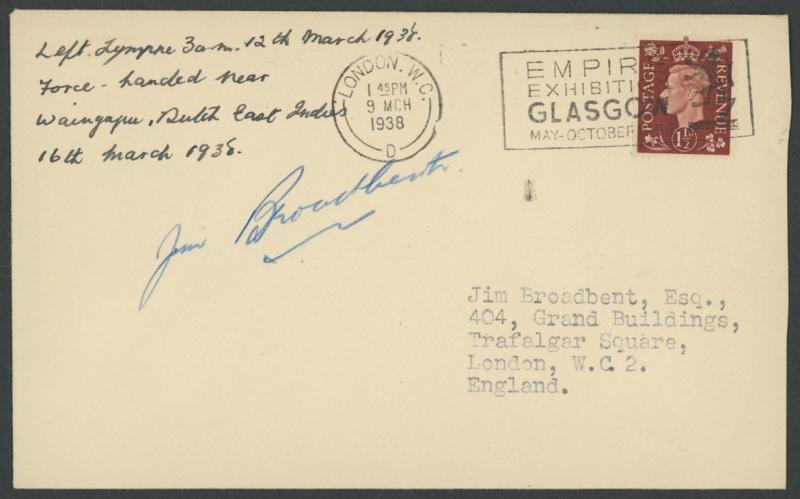 London WC & signed "Jim Broadbent", AAMC 798, Cat $325. Harry ("Jim") Broadbent had an uneventful flight to the Dutch Indies but had a bad landing on Sumba Island, breaking his propellor & ending the flight. Illustrated in Volume Three at page 221. (Image1) (Image2)