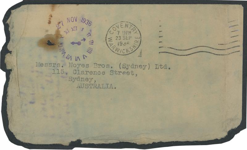 the accompanying OHMS DLO ambulance envelope - roughly opened with repaired tear at upper-right - with Sydney arrival backstamp of 27NOV/1936, AAMC 631, Cat from $450. See Volume Three at pages 143-154, where it is listed as cover #12 of 22 recorded