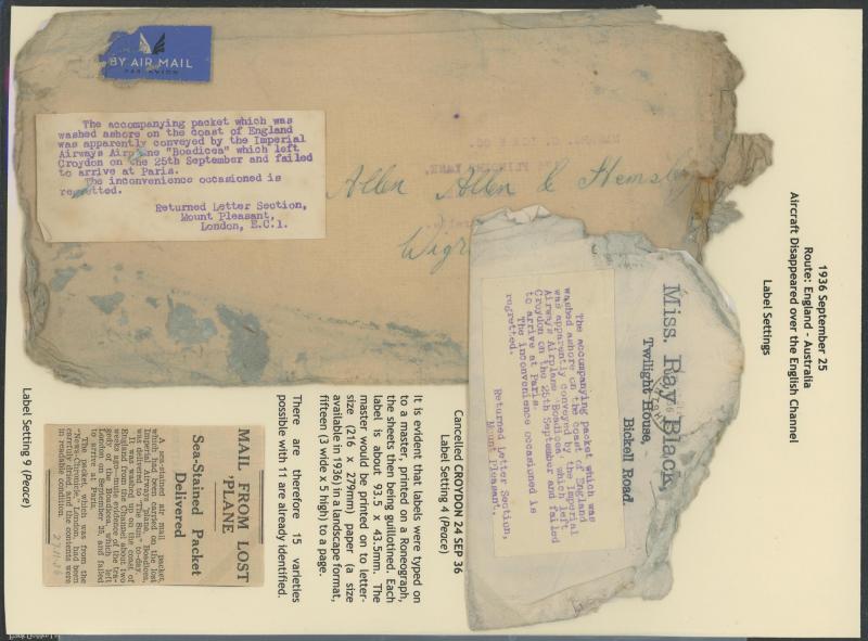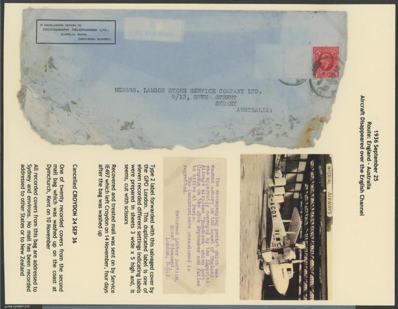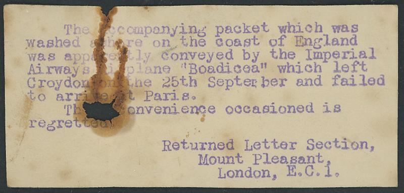 disappeared over the English Channel killing both occupants, water-damage & the stamps lost, roneo'd advice label (Type 6 of 12) affixed with a paperclip that rusted & now separated, superb clock datestamp of 27NOV1936 in violet, another strike on