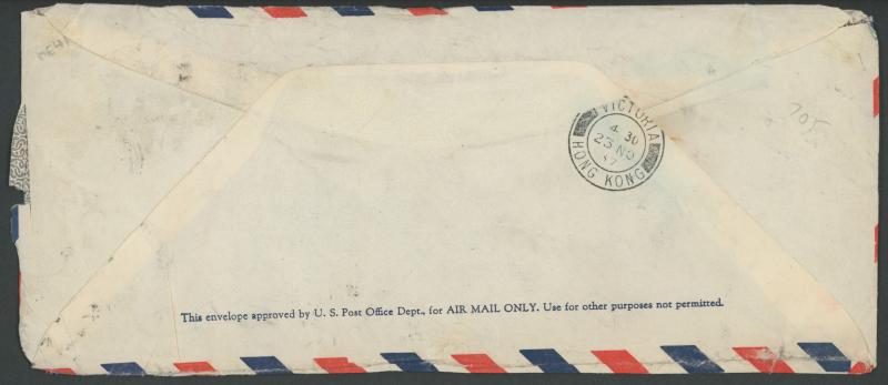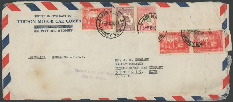 1937 (Nov 16) Hudson Motor Car Co (Sydney) cover endorsed "Australia-Hongkong-USA" to the Head Office in Detroit with rare franking