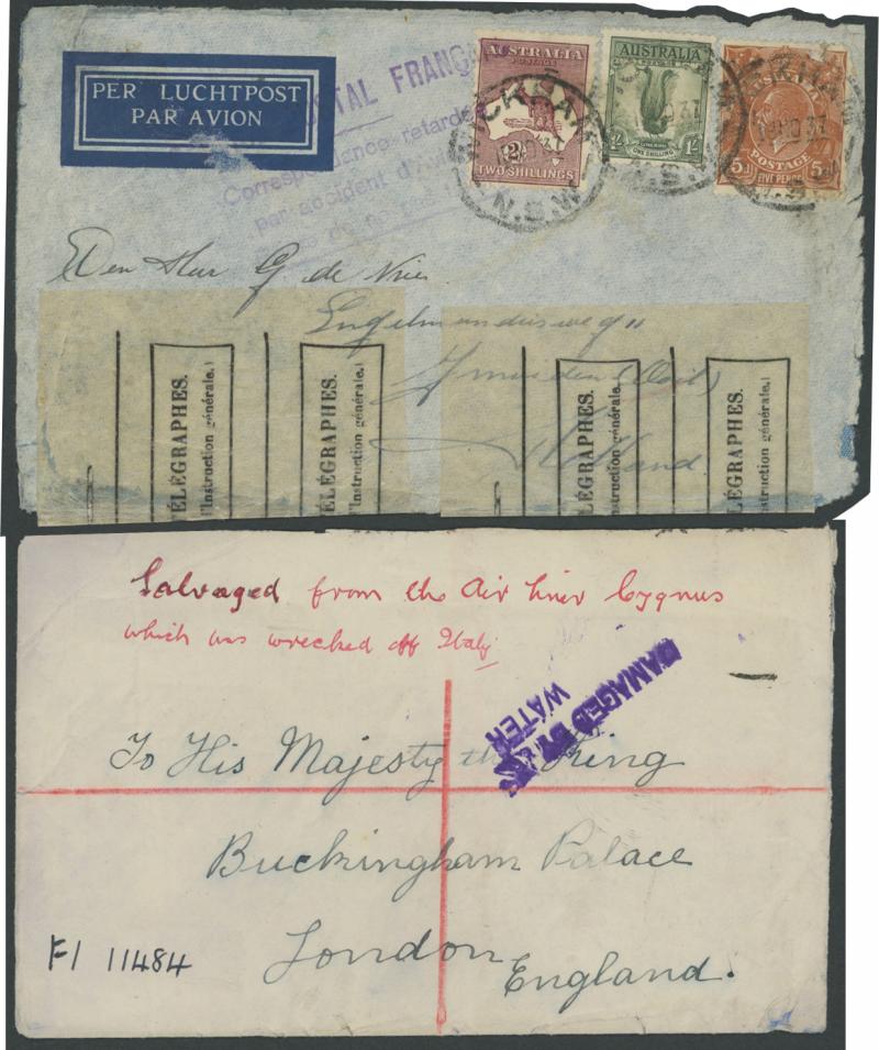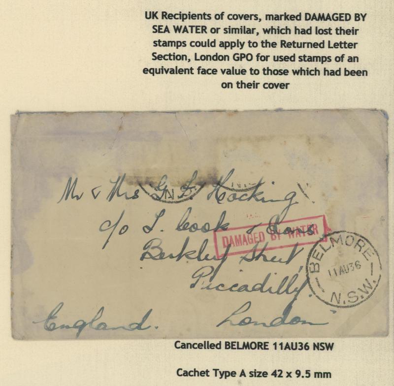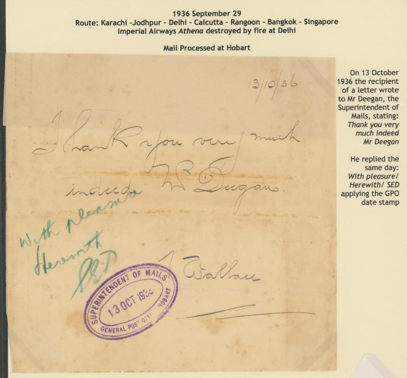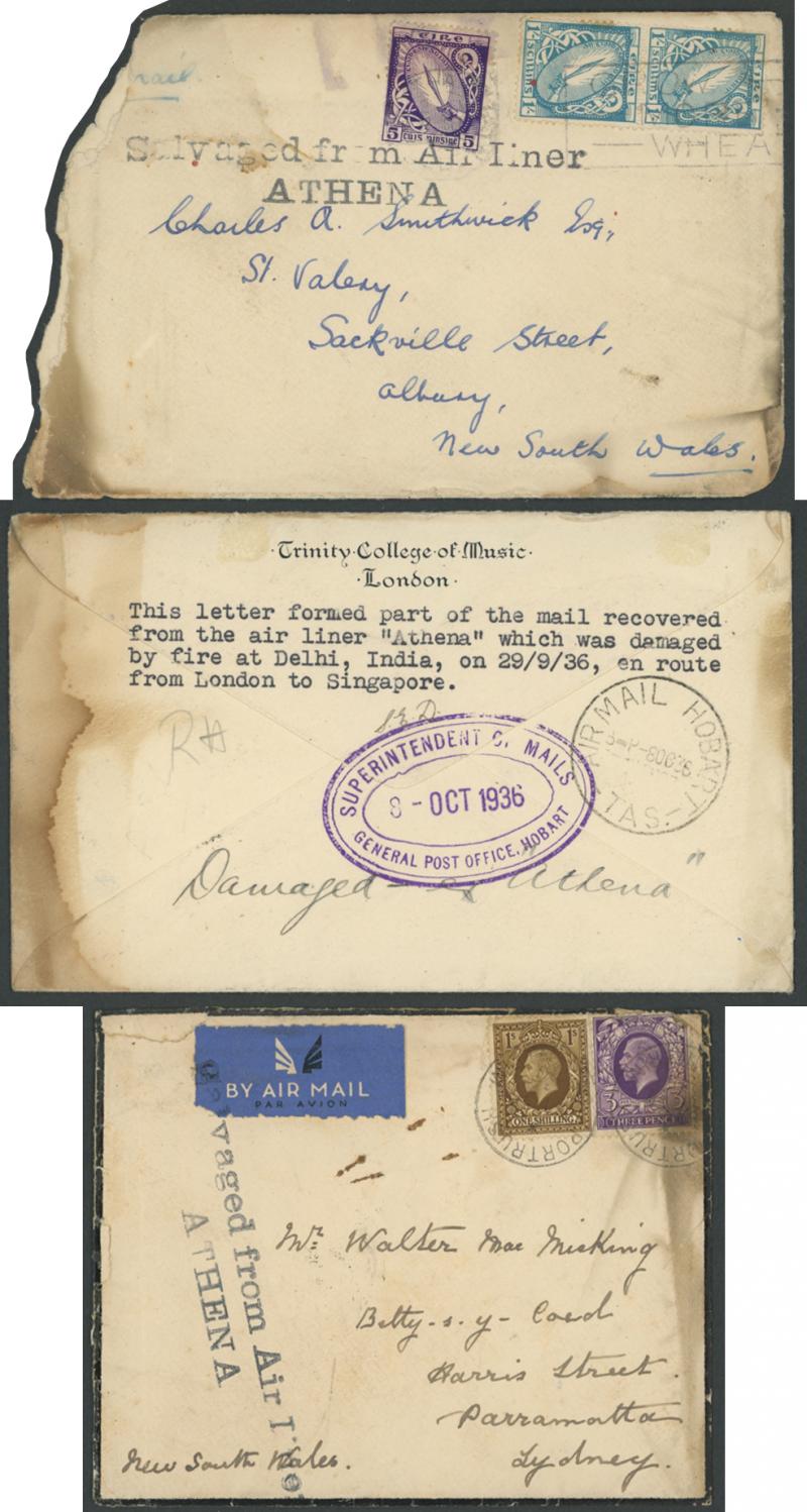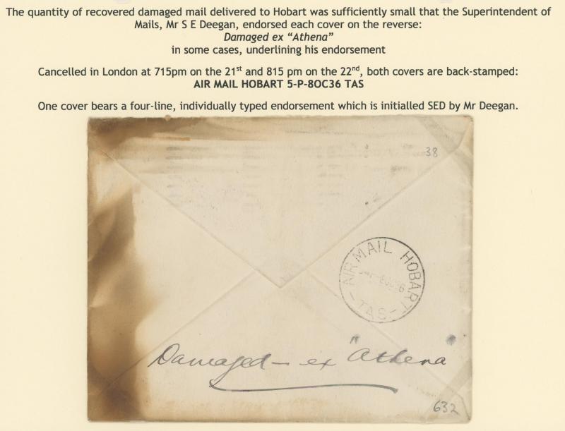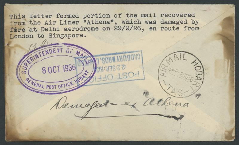 HOBART/8OC36/TAS' arrival cds, official endorsement "Damaged ex Athena" plus typed advice across the flap & superb triple-oval 'SUPERINTENDENT OF MAILS/8OCT1936/GENERAL POST OFFICE HOBART' datestamp in violet, minor peripheral fire-damage, AAMC 632,