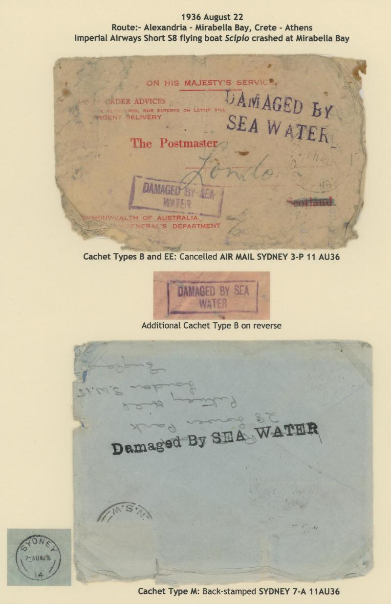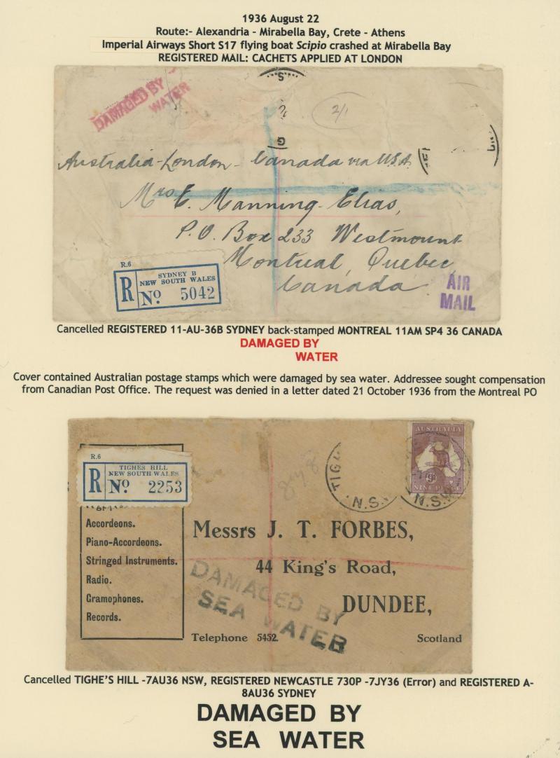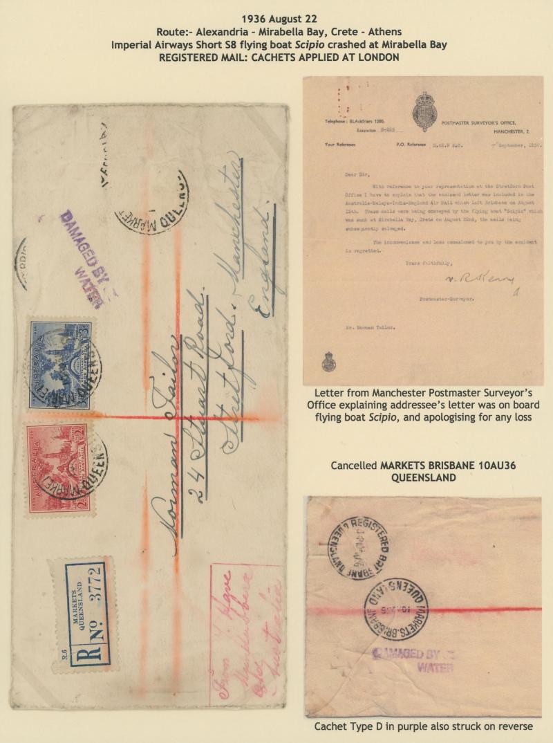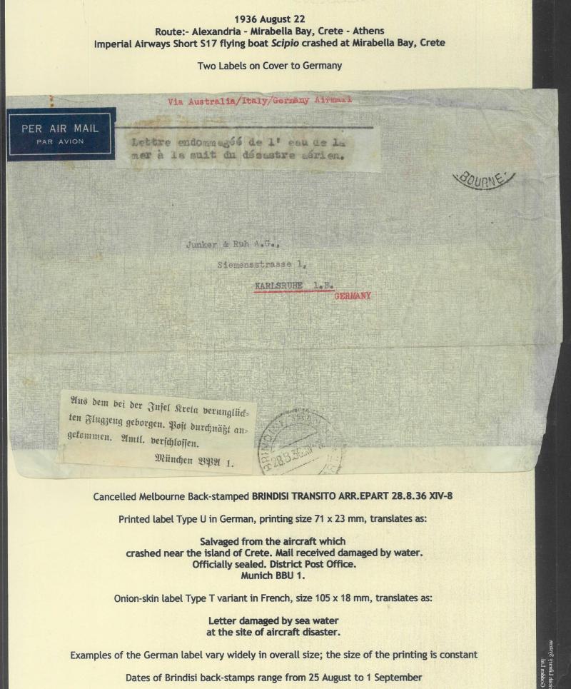 but which crashed in Brindisi Harbour on 5.12.1937 causing two deaths, Brian Peace's exhibit pages with covers x7 mostly with the stamps washed-off, one registered to King George V, one with British explanatory note, one to Holland at 3/5d