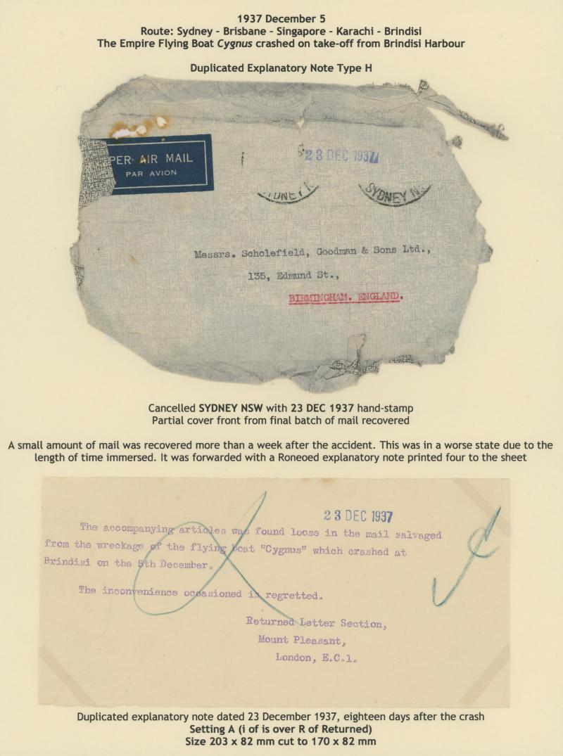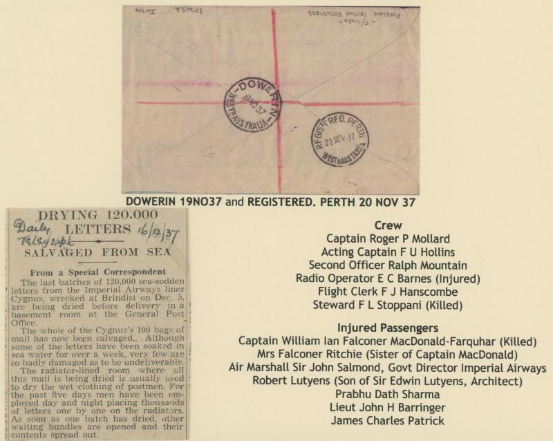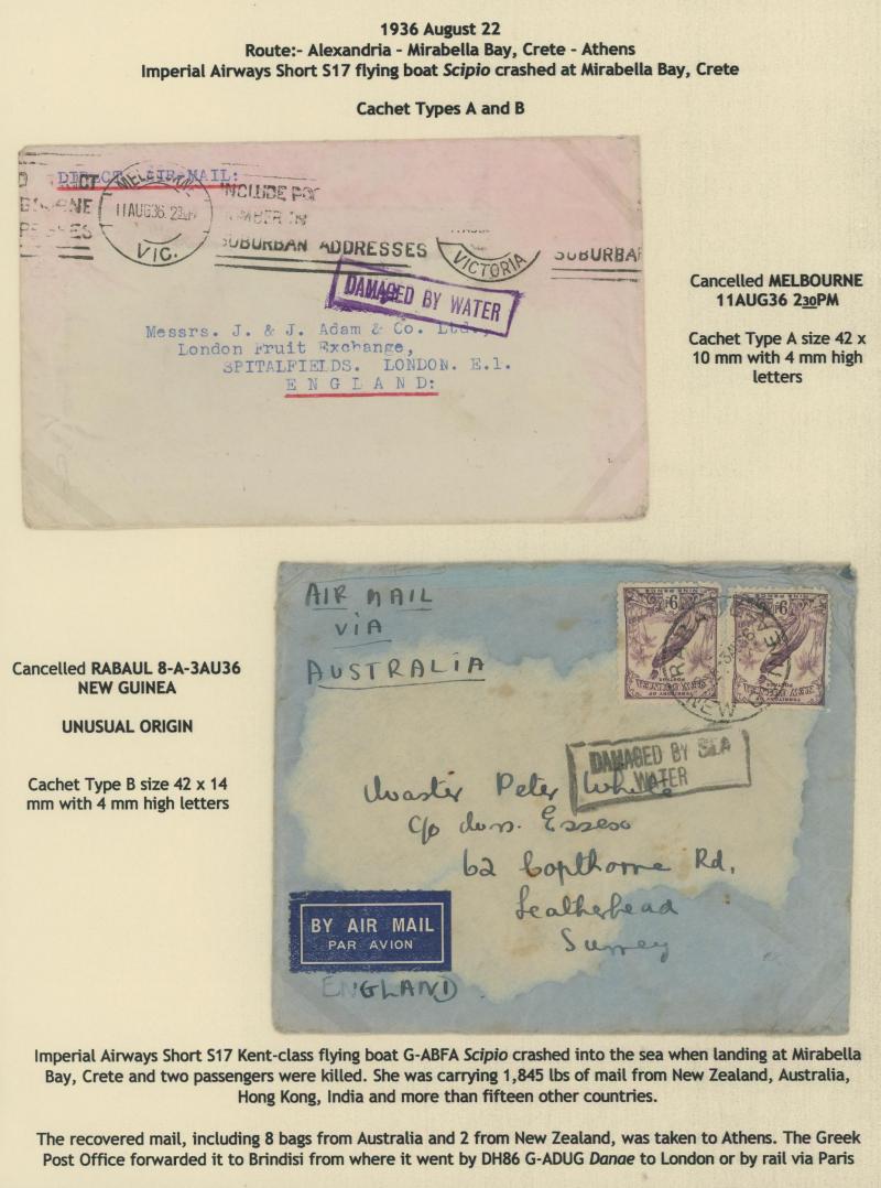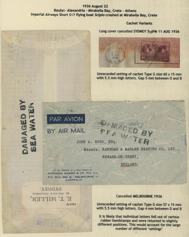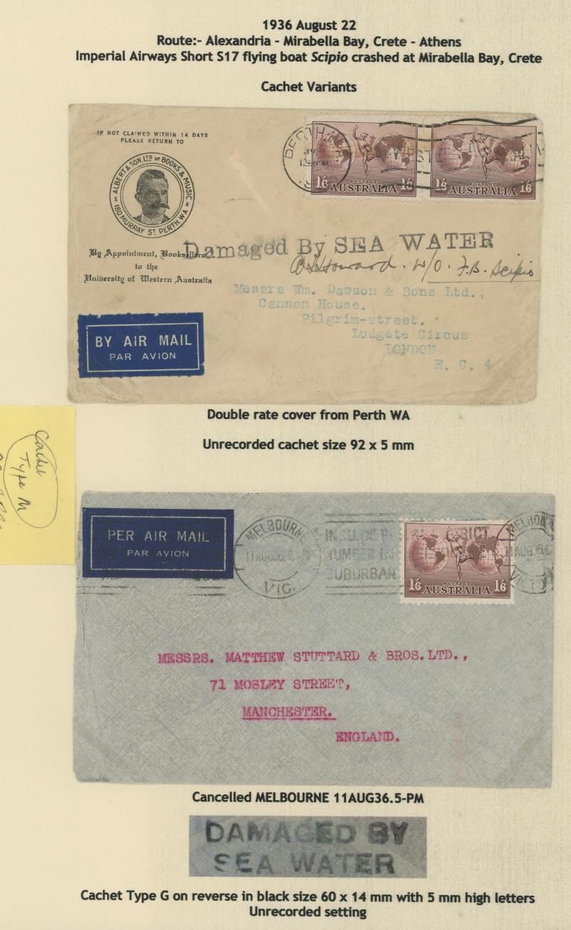 but which crashed in Brindisi Harbour on 5.12.1937 causing two deaths, Brian Peace's exhibit pages with covers x7 mostly with the stamps washed-off, one registered to King George V, one with British explanatory note, one to Holland at 3/5d
