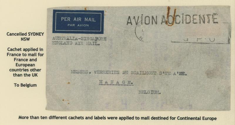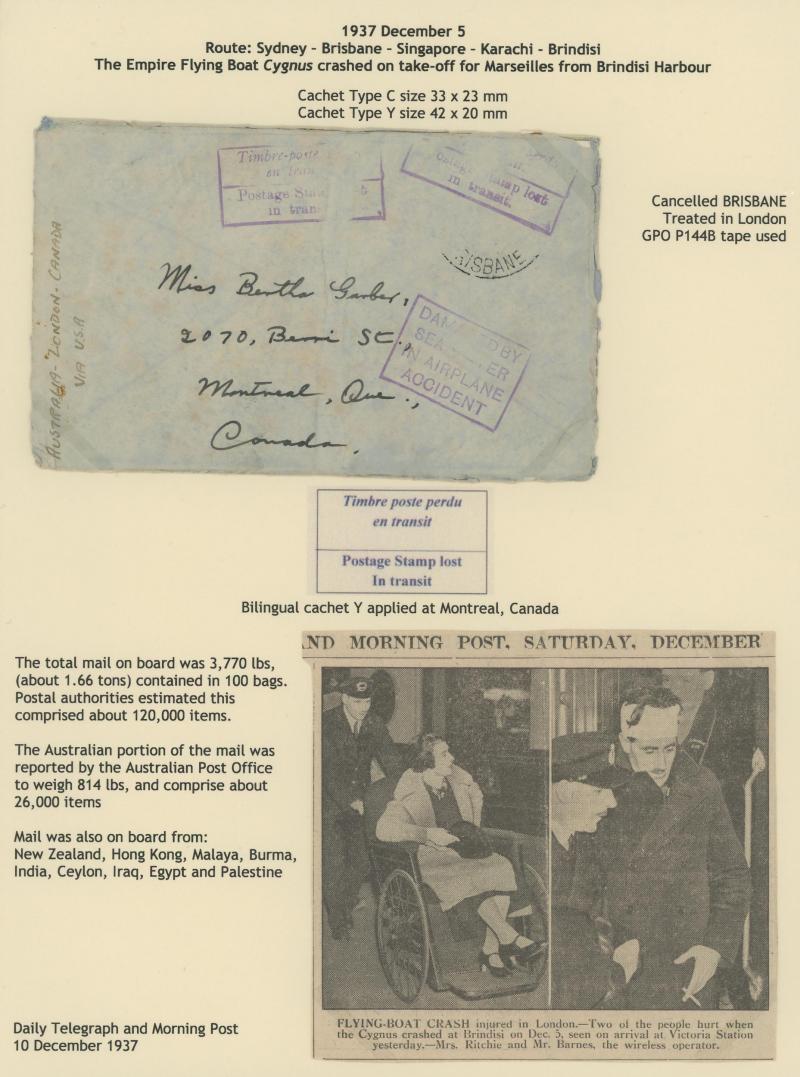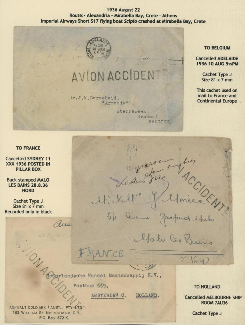 takeoff, with no loss of life, selection on Brian Peace's exhibit pages mostly from England plus Ulster (one of 3 to Australia) & Ireland (one of 2 to Australia) to NSW x5 (four with 'Salvaged from Air Iiner' cachet, plus two printed advices with