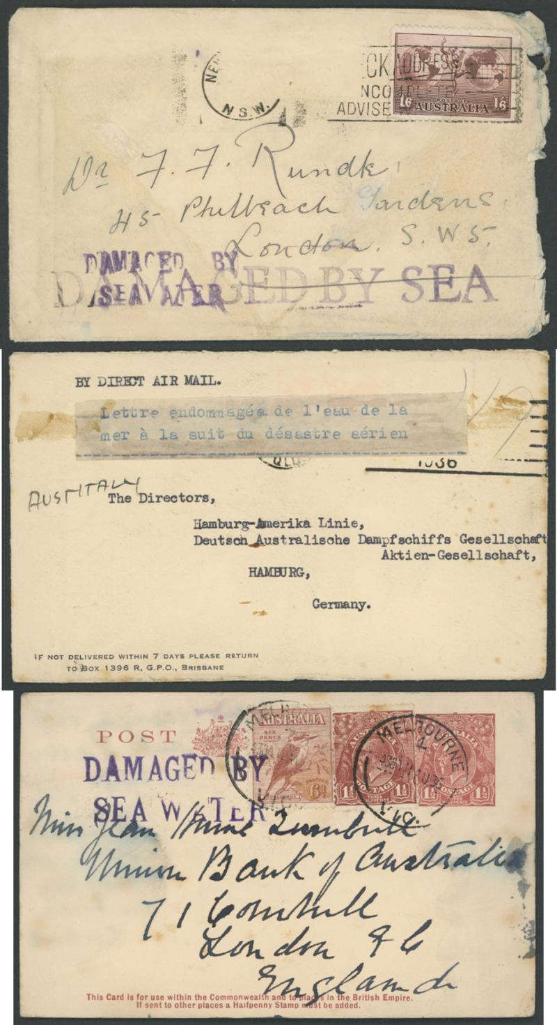 Auckland (missent to New Zealand); or Victoria x6 all with roneo'd advice but only one with 'Received Water Damaged/Ex.Flying Boat Calpurnia' handstamp; most with the stamps washed-off, AAMC 834, Cat from $125 x23 plus the other items. See Volume