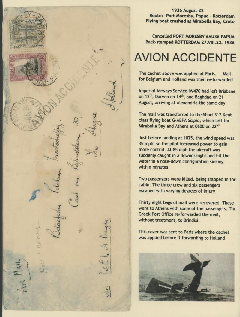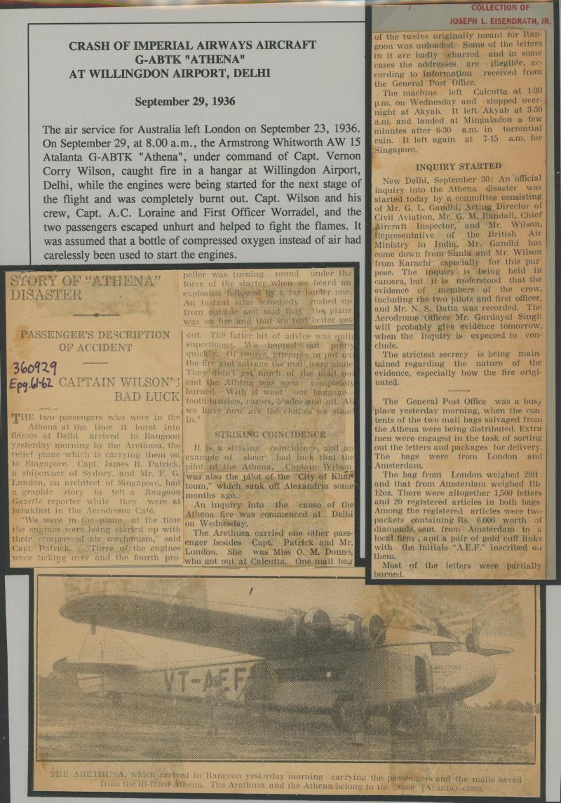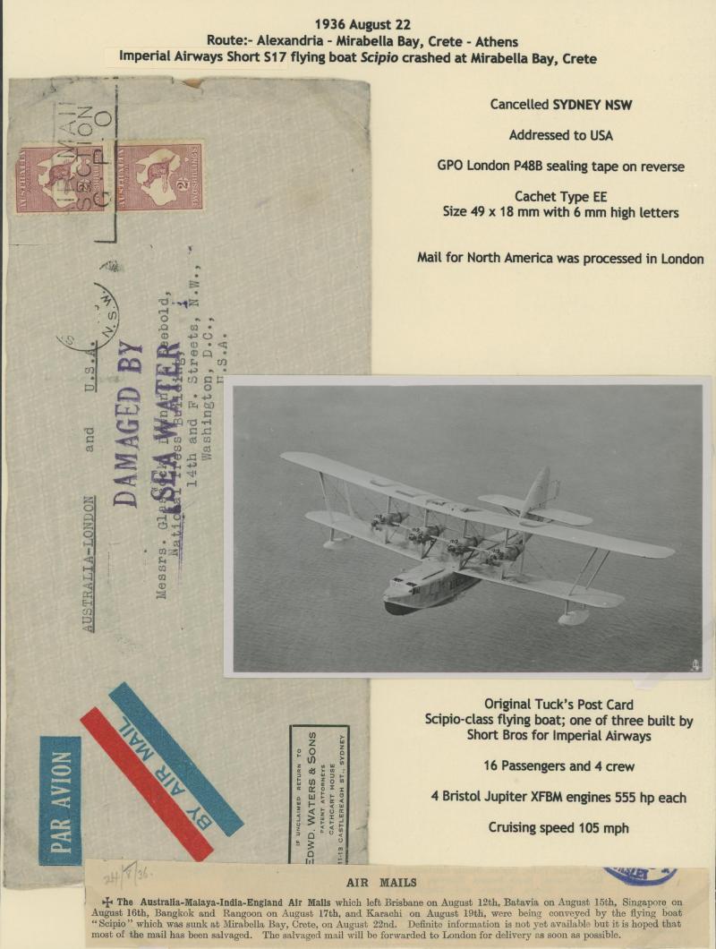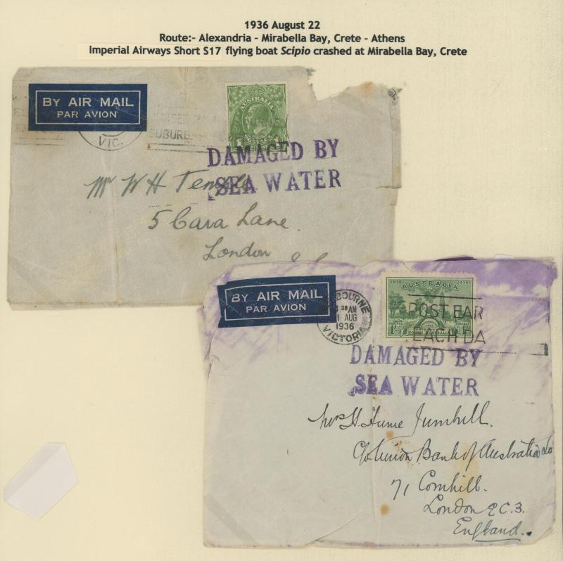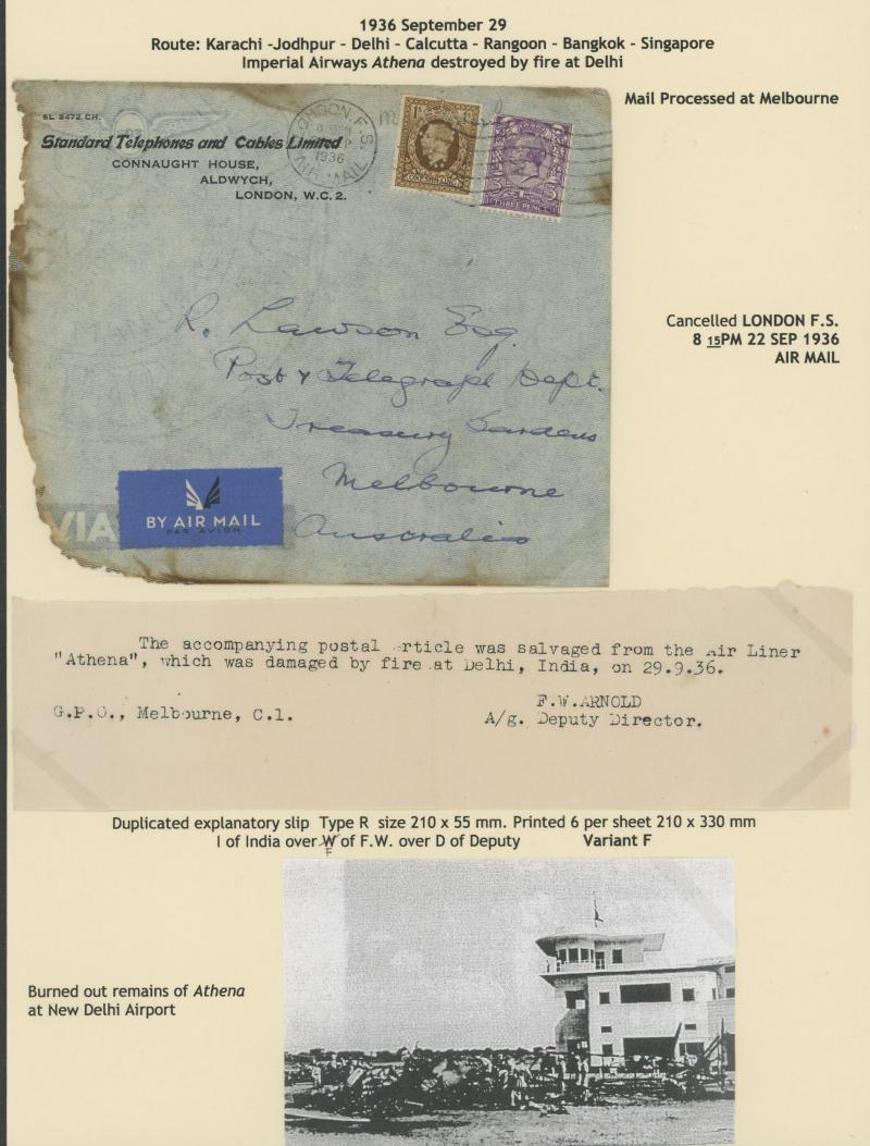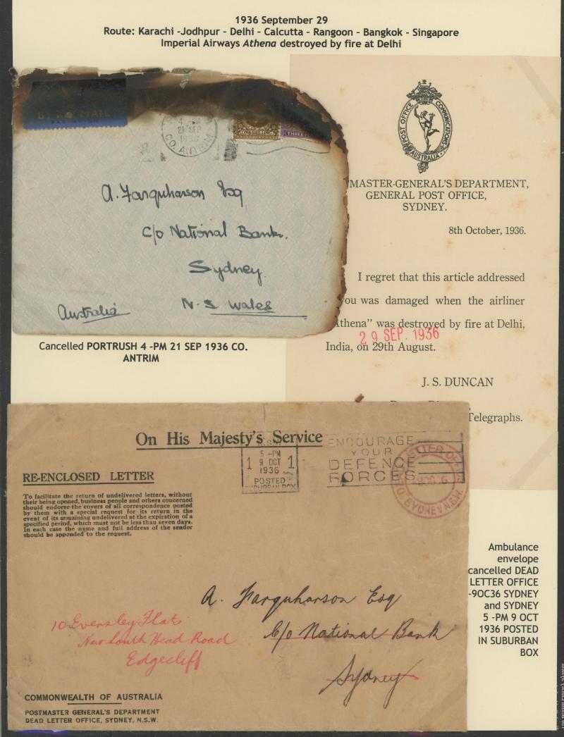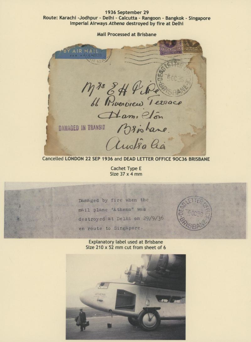 1936 (Sep) England-Australia per Imperial to Karachi where mails transferred to 'Athena' which burst into flames just before
