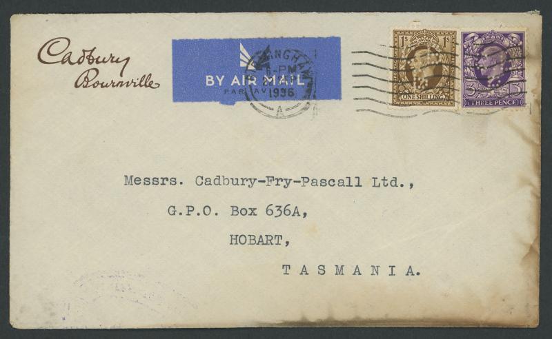 takeoff, with no loss of life, Cadbury Bournville advertising cover to their facility in Hobart with KGV Photogravure 3d & 1/- with 'CB/B' perfins & boxed 'POST OFFICE/22DEP1936/CADBURY BROS LIMITED' backstamp in blue, the reverse with 'AIR MAIL