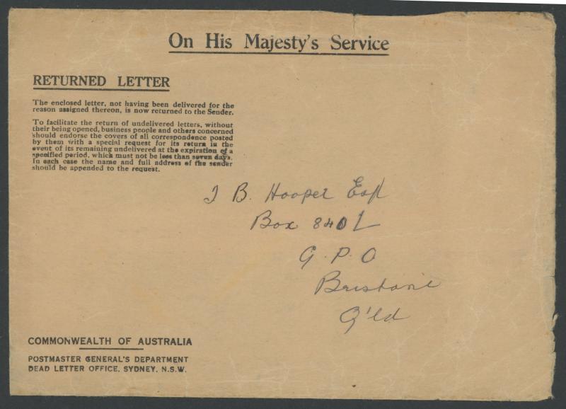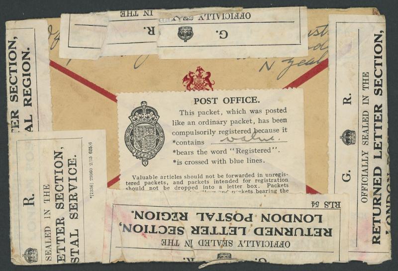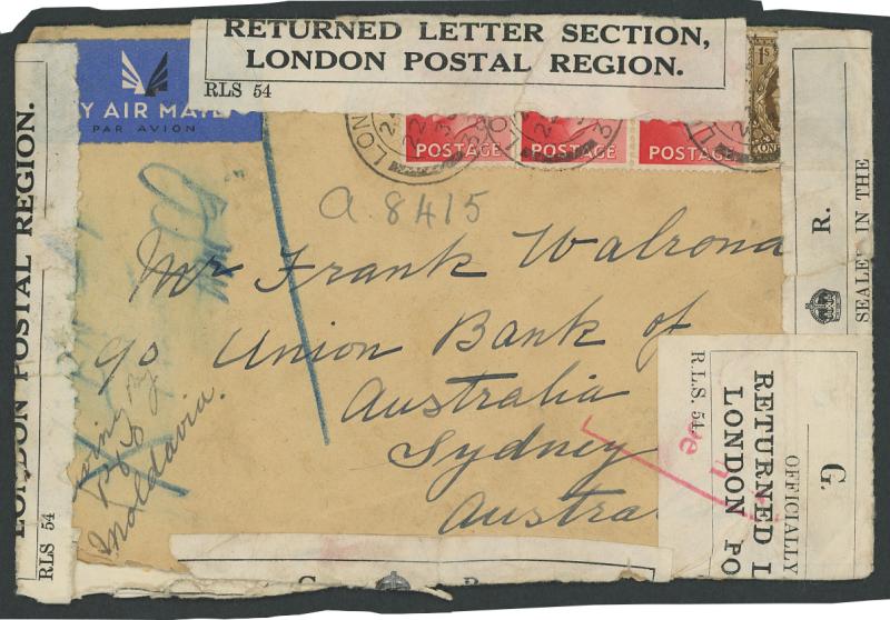 multiple 'OFFICIALLY SEALED IN THE/RETURNED LETTER SECTION/LONDON POSTAL REGION' labels, with the enclosed printed GPO Sydney advice with the incident date corrected & a photo (surface faults), AAMC 632, Cat from $250. See Volume Three at pages