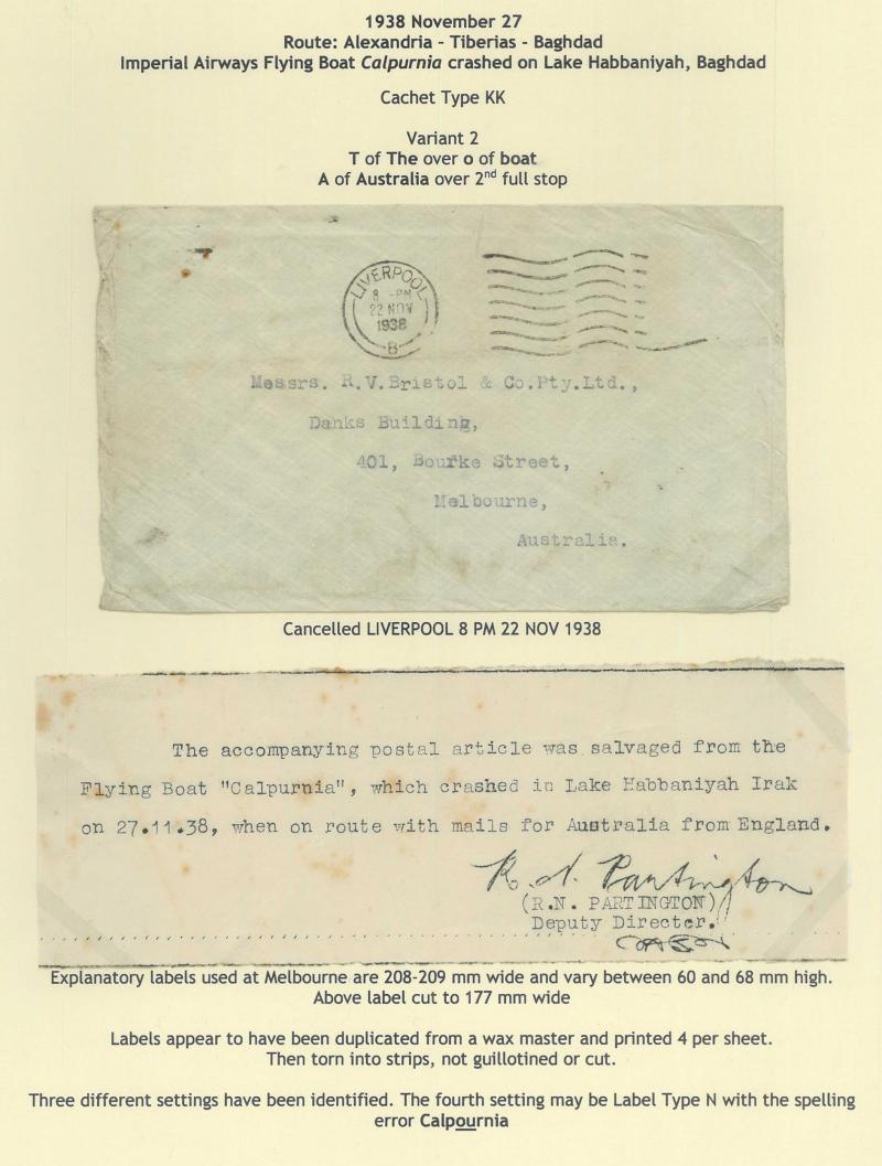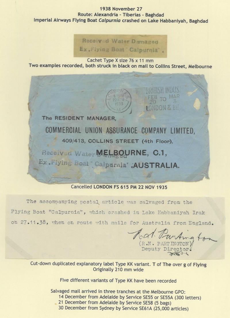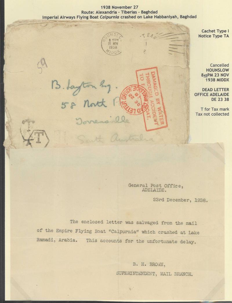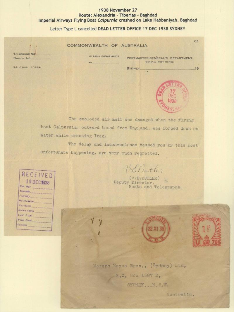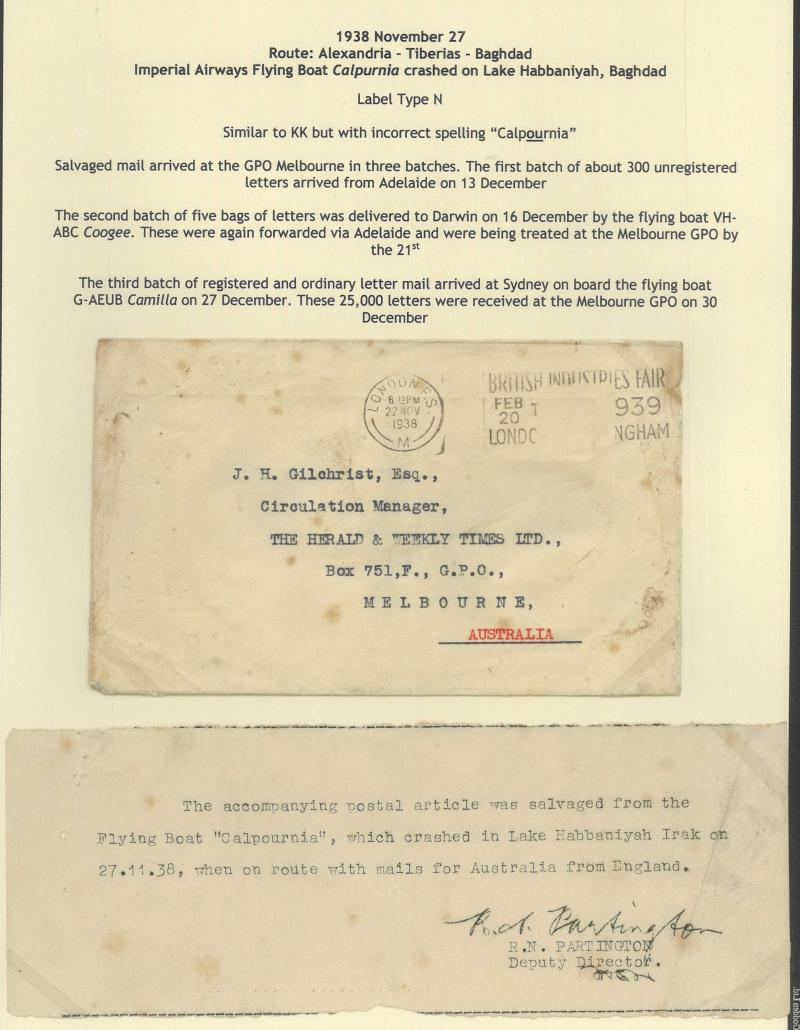1938 (Sep) England-Australia Empire Air Mail Scheme (EAMS) service per 'Calpurnia' which crashed into Lake Habbaniyah (Iraq), with