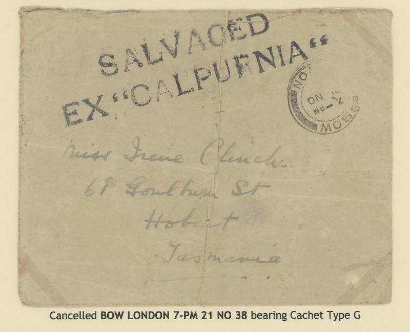 Scotland endorsed "address/not visible" with boxed crash cachet & DLO cds both in red; South Australia x3 (one with 'T' handstamp) all with roneo'd letters; Tasmania x5 with huge 'SALVAGED/EX CALPURNIA' cachet x3, or boxed cachets of Brisbane or