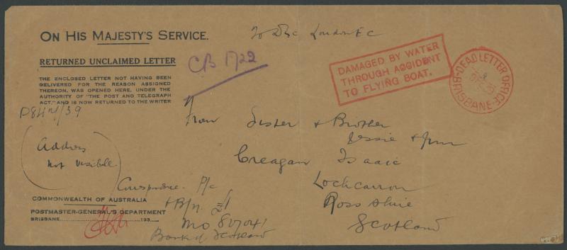 four fatalities, covers to NSW with 'Received in/ SYDNEY NSW/DAMAGED' in rosine; Queensland with boxed 'DAMAGED BY WATER/ THROUGH ACCIDENT/TO FLYING BOAT' in red; South Australia with roneo'd advice (tonespots) & DLO ambulance envelope; Tasmania with