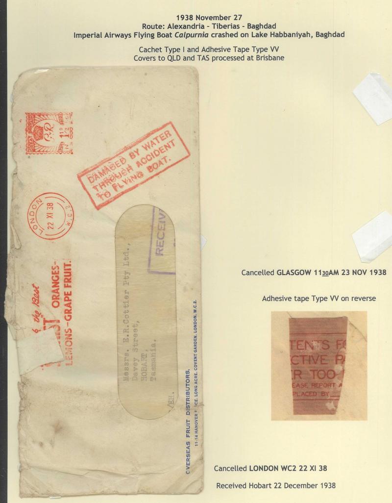 LIMITED' backstamp in blue & 'BOURNVILLE' R label, per Imperial Airways flying boat 'City of Khartoum' ex Brindisi, which crash-landed on approach to Alexandria, to "Cadbury-Fry-Pascall/Hobart" with Seahorse 2/6d washed-off & roneo'd slip affixed to