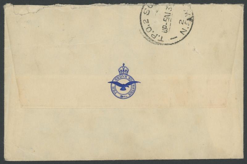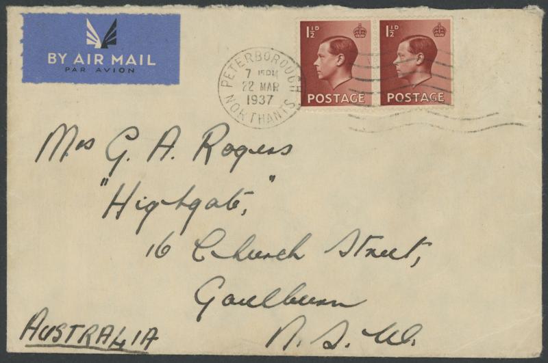 1937 (Mar 22) RAF cover (insignia on the flap) from England to NSW with Great Britain KEVIII 1½d brown booklet pair (1/- stamp