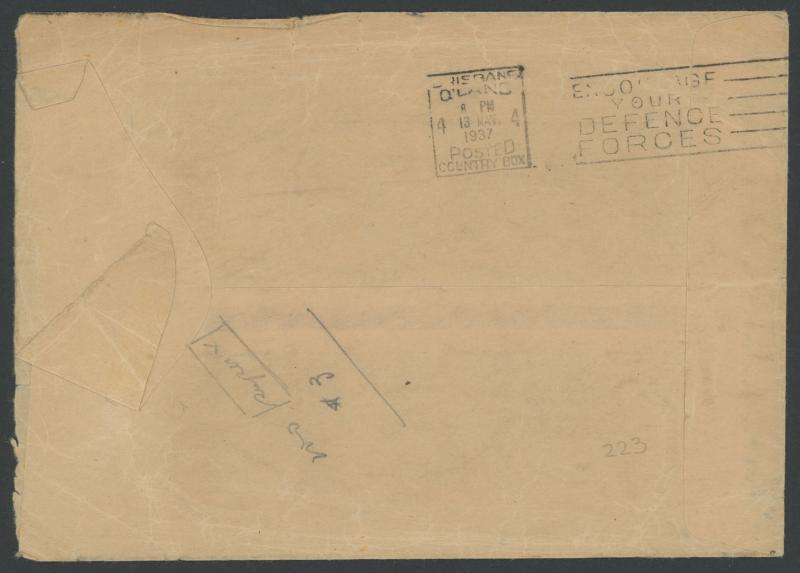1937 (May 12) Chevron Hotel cover (emblem on flap) to Brisbane per Airlines of Australia DH86 Dragon Rapide 'Spirit of Shell', with