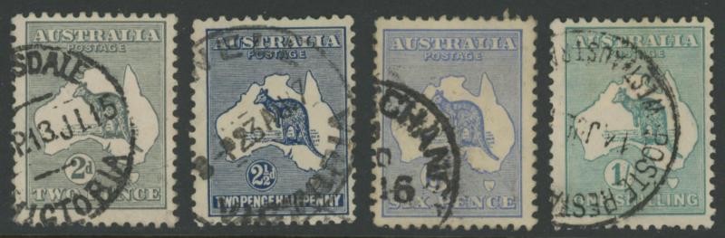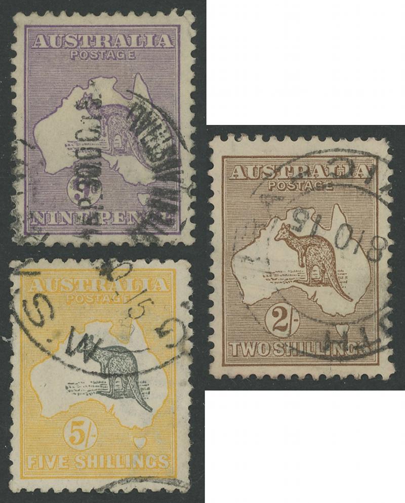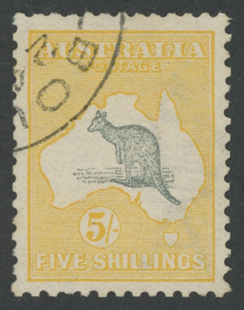 5/- grey and yellow SG 13, well-centred, a couple of slightly uneven perfs, with CTO with small-part Melbourne '24' cds cancel for