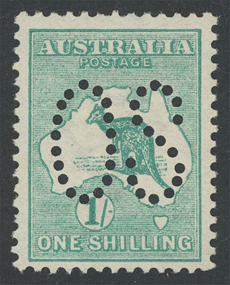 1/- green ACSC 30b (SG O10), very fresh, well-centred, lightly mounted, Cat $900 (£500). PCNZA Certificate (2025). (Image1) (Image2)