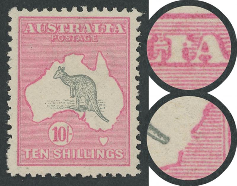 10/- grey & pink SG 14 with Duty Plate variety Broken Coast near Sydney & Flaw on 'I' of 'AUSTRALIA' [Pos R43] ACSC 47(AD)j,