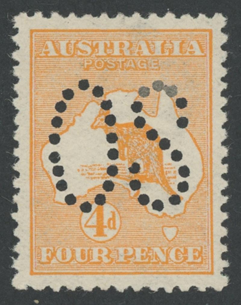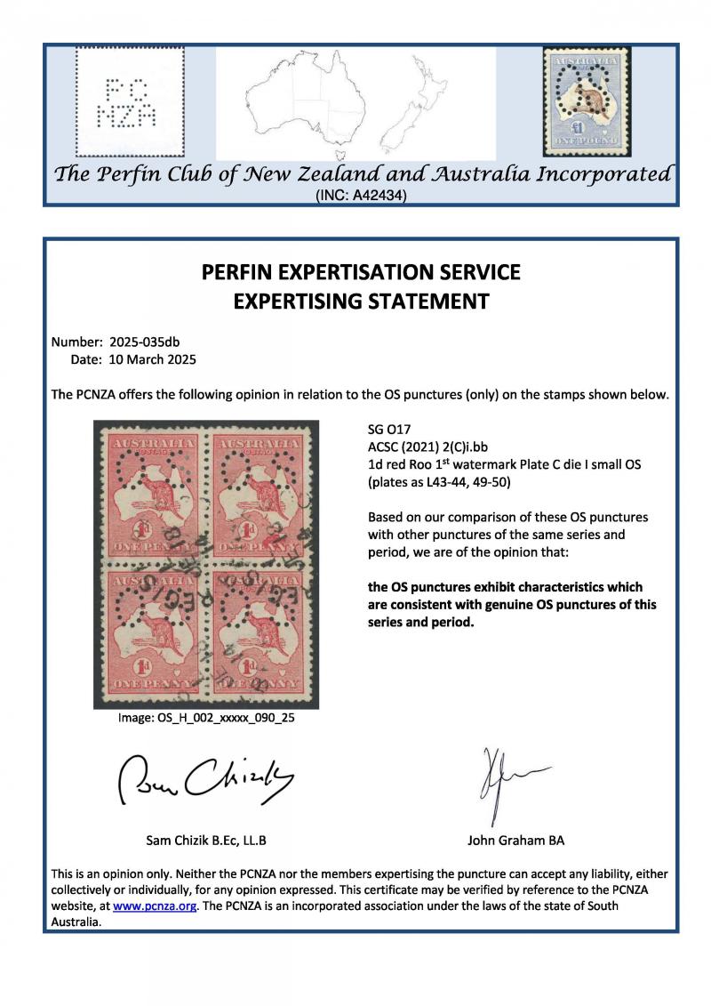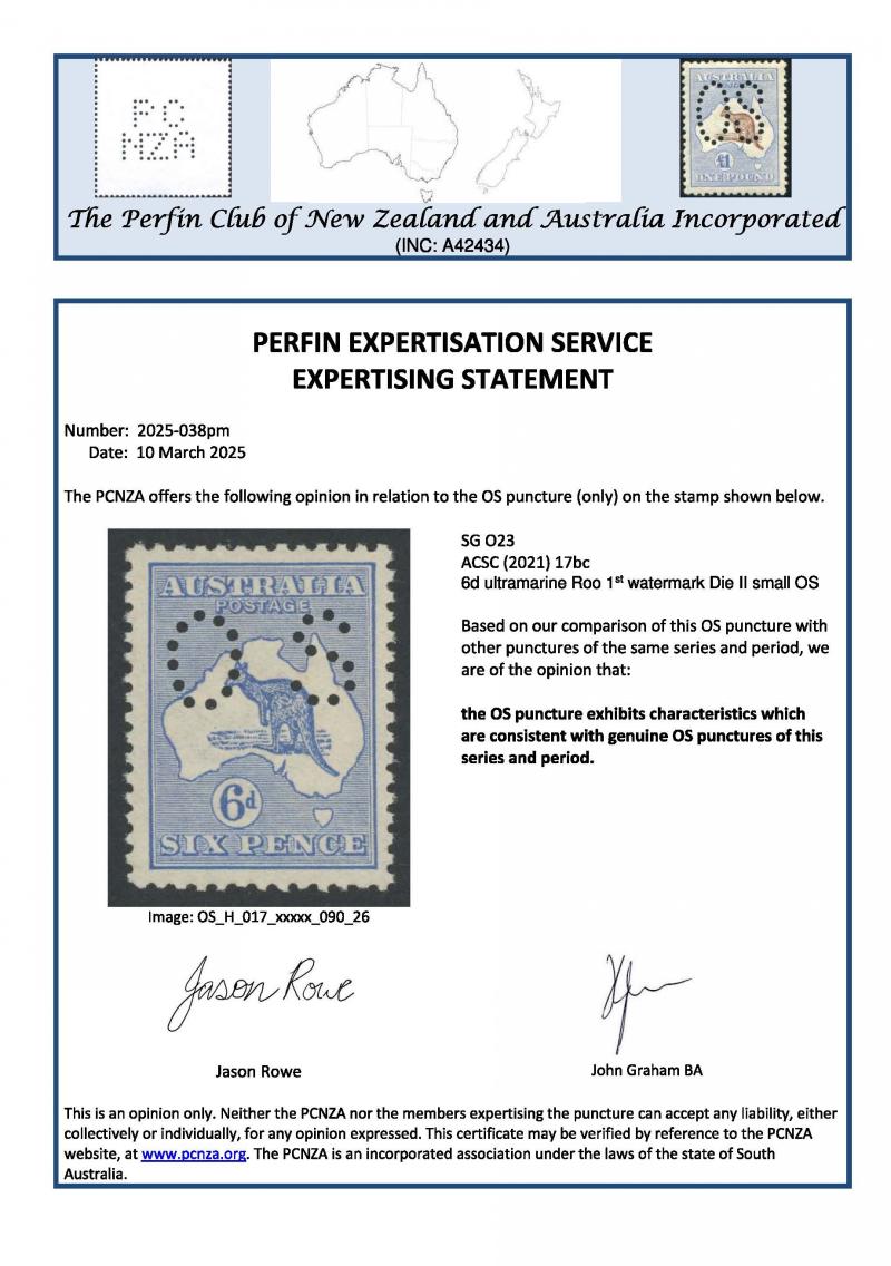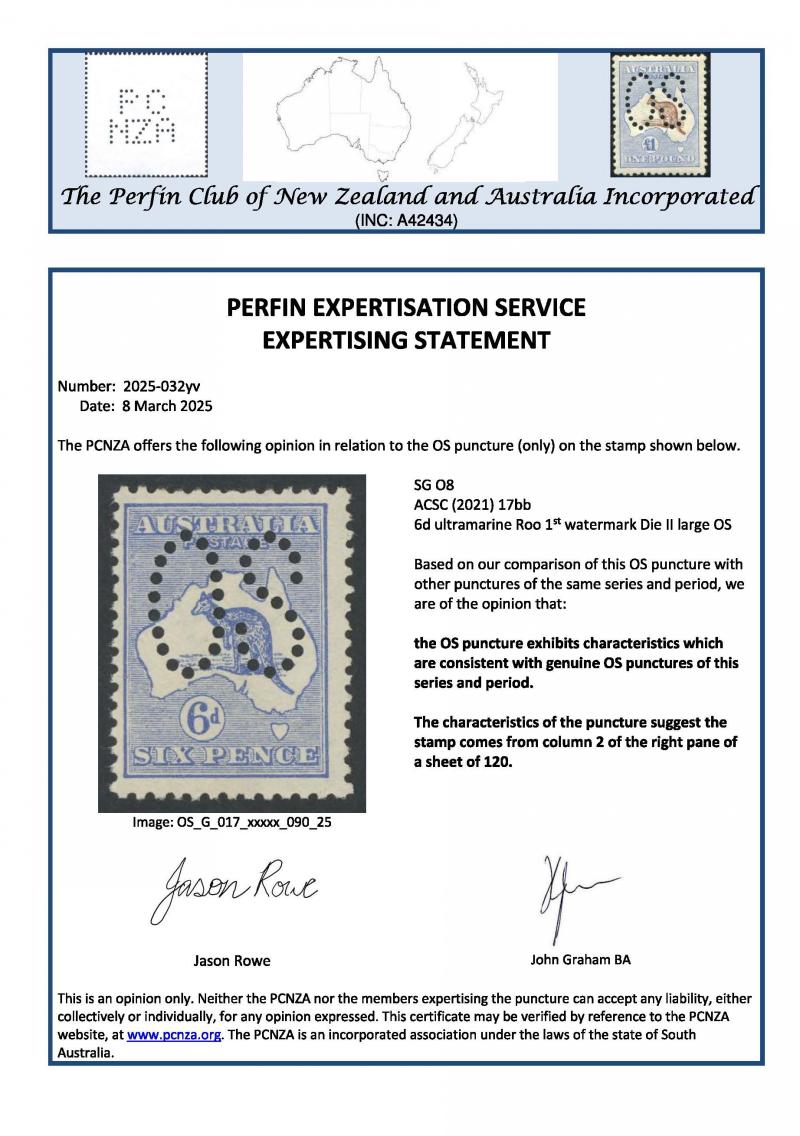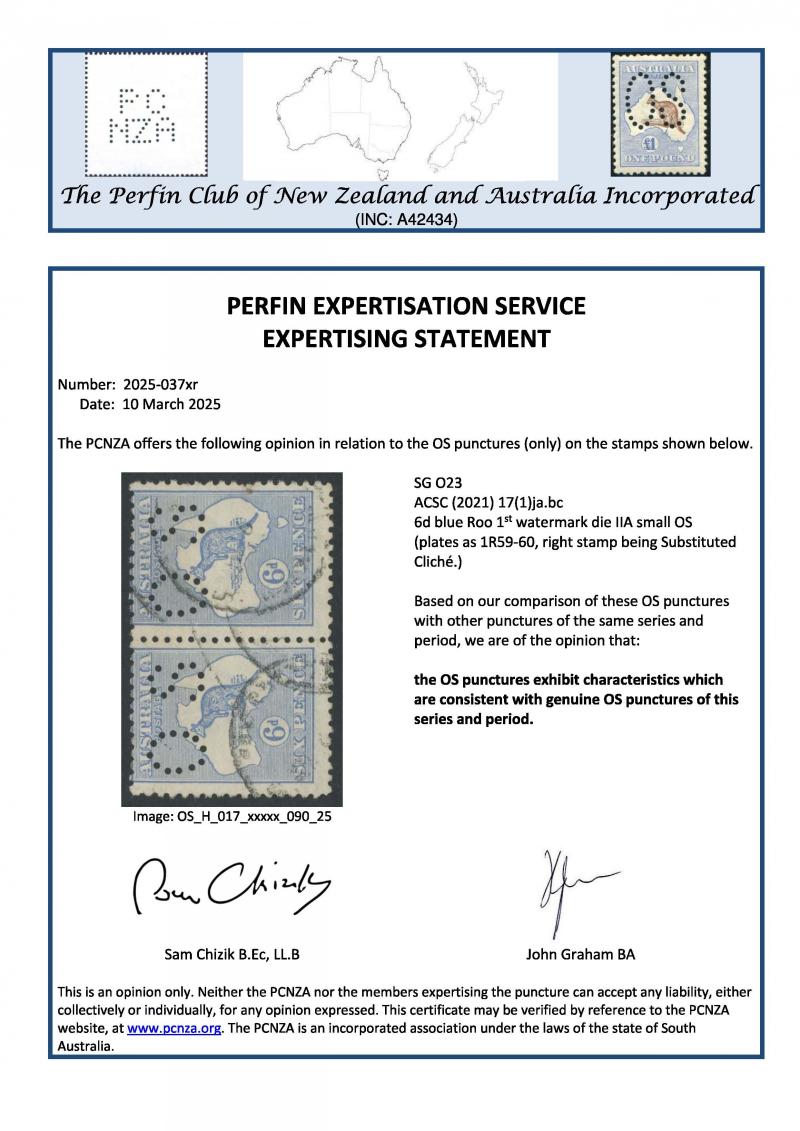 states that "the substituted cliche is significantly scarcer than the retouched 'E' by a ration of about 1 to 6" and goes on to mention three examples with inverted watermark, but does not mention any punctured 'OS'. (Image1) (Image2)