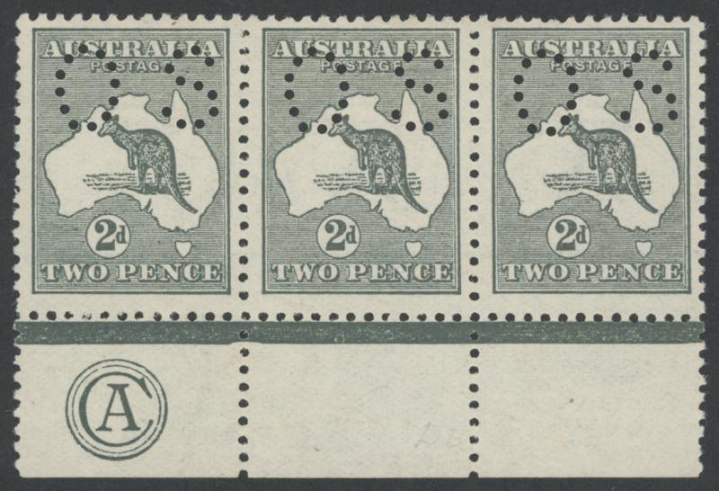 2d grey SG O18 Plate 2 'CA' Monogram single ACSC 5(2)za in strip of 3, lightly mounted on the monogram margin only, the stamps