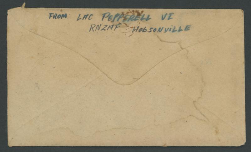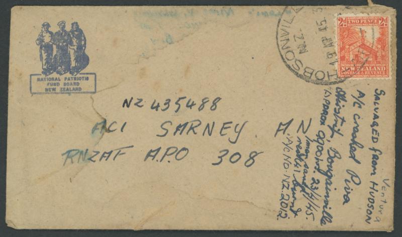 crashed on the runway, killing three of the five occupants, to "RNZAF APO 308" with 2d Whare tied by 'HOBSONVILLE/19AP45/AIR FORCE' cds, endorsed on the face "Salvaged from Hudson a/c crashed Piva Airstrip, Bougainville approx 0900 hrs 23.4.45",