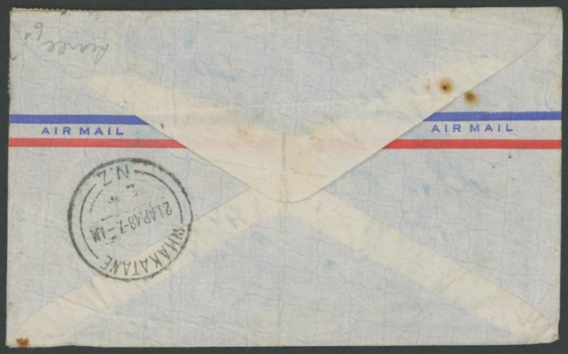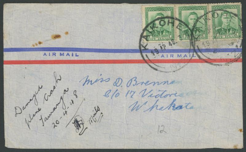 that caused it to crash into the bay, with no casualties, to "Whakata" wih 1d green strip of 3 tied by 'KAIKOHE' cds, endorsed at lower-left "Damaged/plane crash/Tauranga/20-4-48/[initials] Mails", 'WHAKATANE/21AP48/NZ' arrival backstamp. See Volume