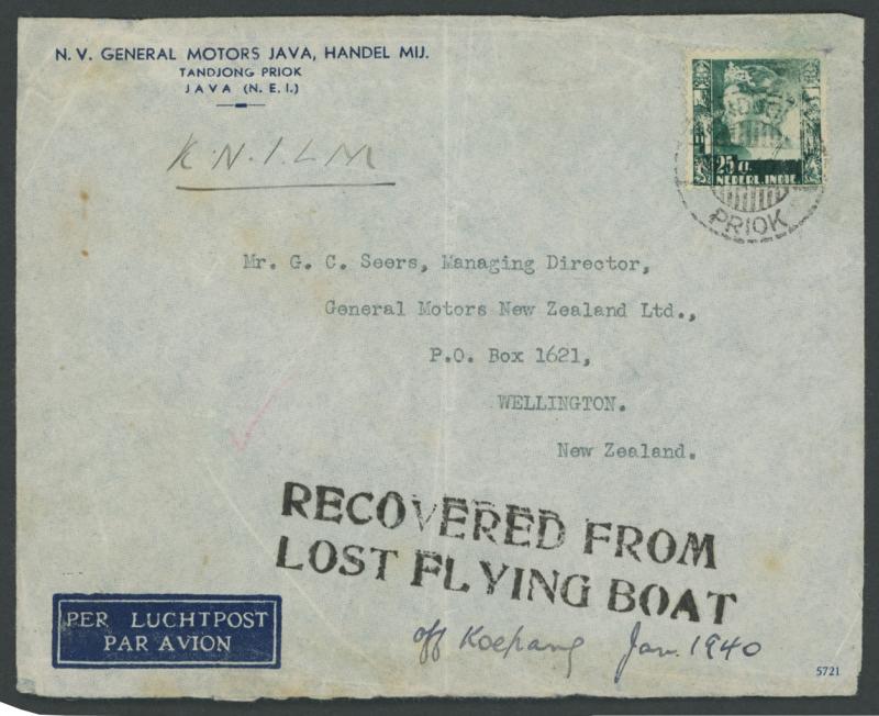 with Netherlands Indies 25c tied by 'TANDJONG/PRIOK' cds, to Wellington with huge 'RECOVERED FROM/LOST FLYING BOAT' cachet of Sydney, minor blemishes, AAMC 888, Cat from $350. Note: the aircraft was a Lockheed land plane, not a flying boat. See