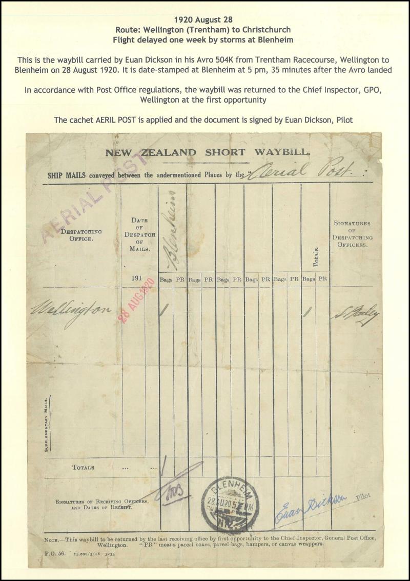 1920 (Aug 28) Wellington-Blenheim-Christchurch 'NEW ZEALAND SHORT WAYBILL' for mail from Wellington with 'AERIAL POST' cachet in