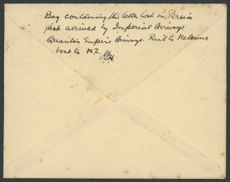 3.11.1934, coming fifth in the handicap section, the cover endorsed on the flap "Bag containing this letter lost in Persia/just arrived by Imperial Airways/Quantas [sic] Empire Airways. Rail to Melbourne/boat to NZ/JDH" (= JD Hewett), Field Marshal