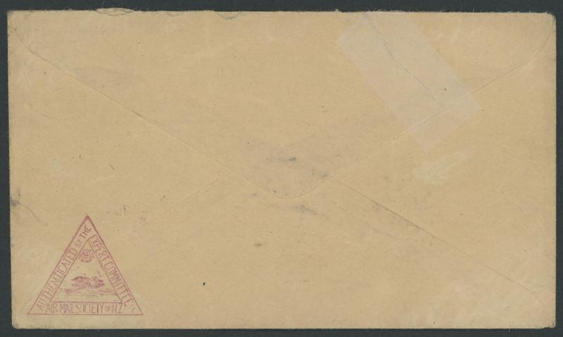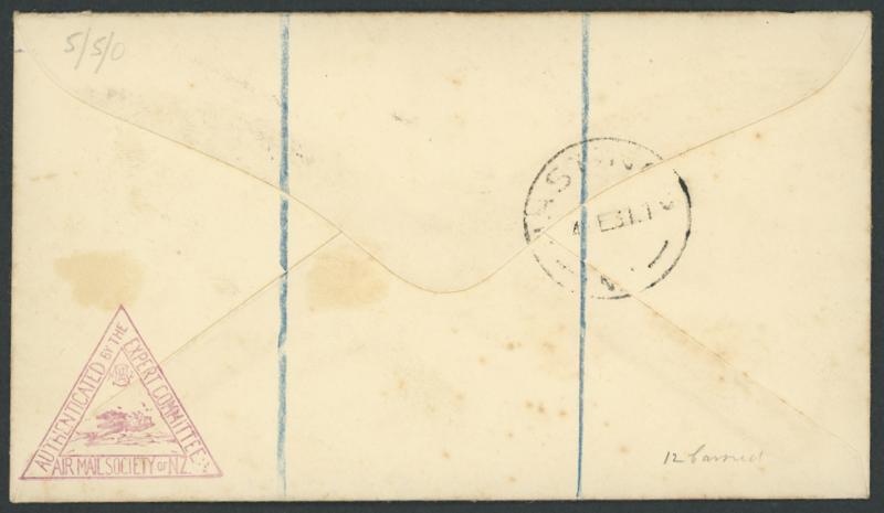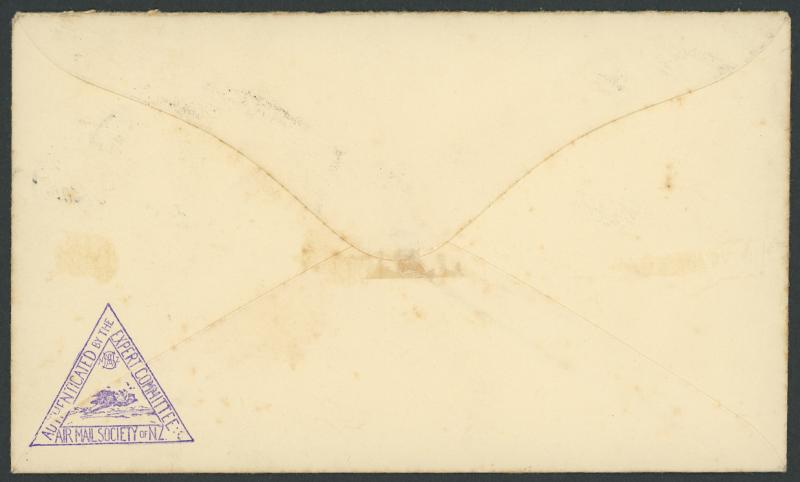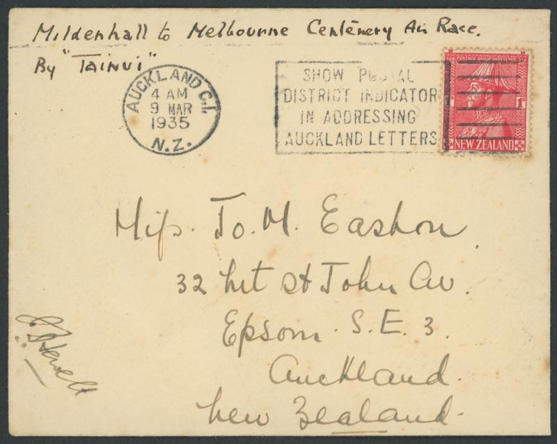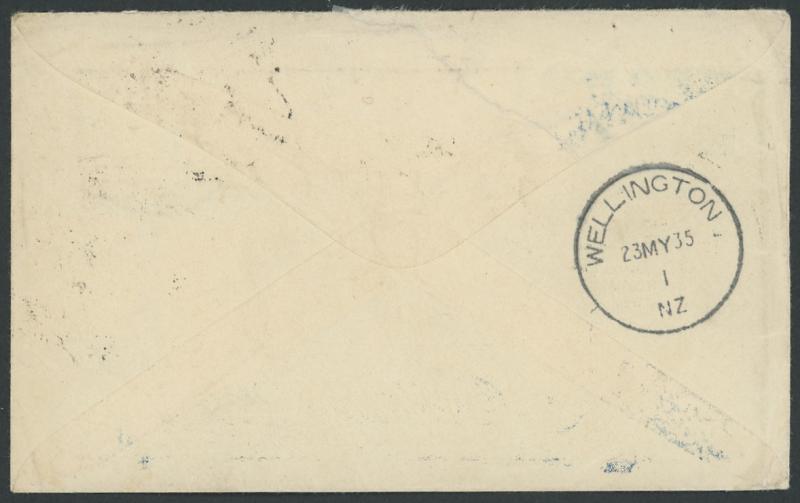 Melbourne cds of '12MY35', superb 'WELLINGTON/23MY35/ 1 /NZ' relief arrival backstamp & another strike tying New Zealand ½d & 1½d to the face, repaired flap tear, see NZAC at page 22. Seven hours into the flight, engine trouble and a damaged