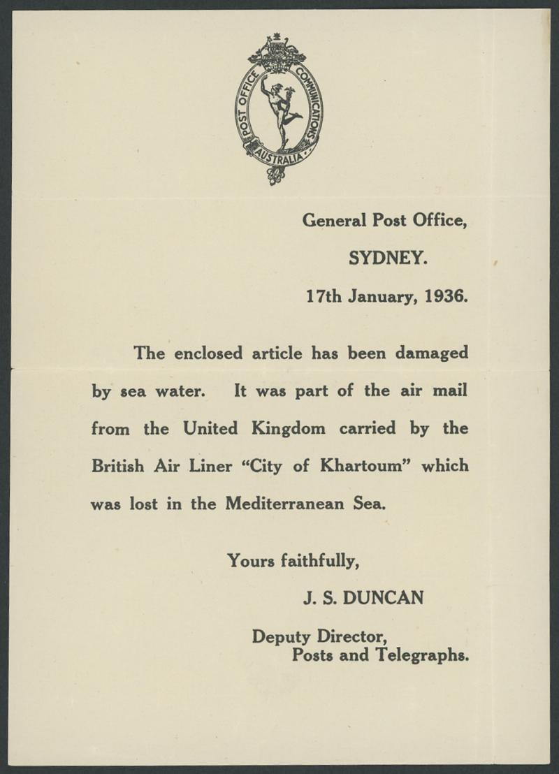 all 11 occupants, placed aboard 'Horsa' ex Alexandria 8.1.1935, 'Athena' Karachi-Singapore, then per 'Brisbane' or 'Adelaide' to Darwin, where the mail was finally opened & dried, the cover severely water-damaged, with the Sydney GPO printed incident