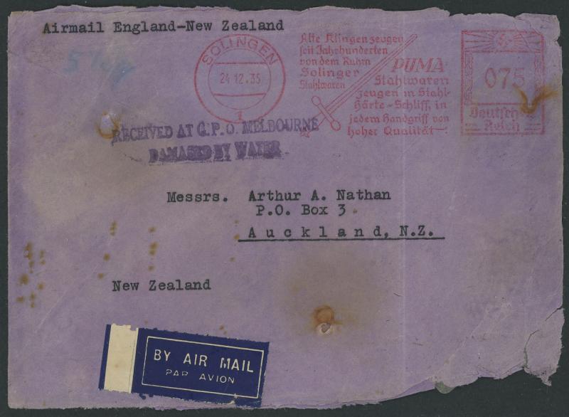 all 11 occupants, placed aboard 'Horsa' ex Alexandria 8.1.1935, 'Athena' Karachi-Singapore, then per 'Brisbane' or 'Adelaide' to Darwin, where the mail was finally opened & dried, from West Germany with 'SOLINGEN/24.12.35' pictorial meter for