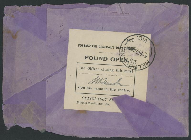 Solingen Steel, significant water-damage, processed through Melbourne with 'RECEIVED AT GPO MELBOURNE/DAMAGED BY WATER' cachet in violet, resealed with 'FOUND OPEN/OFFICIALLY SEALED' label tied by superb 'MELBOURNE/ 25 /20JA36/VIC' cds, Australian