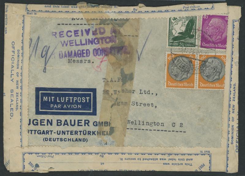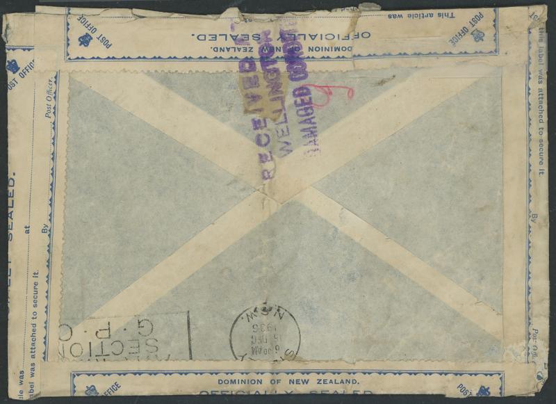 States & New Zealand being on-forwarded by rail with Sydney machine backstamp of '15DEC/1935', badly damaged en route to New Zealand with blue/white 'OFFICIALLY SEALED' labels on all sides & large 'RECEIVED AT/WELLINGTON/IN DAMAGED CONDITION' cachet