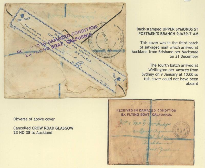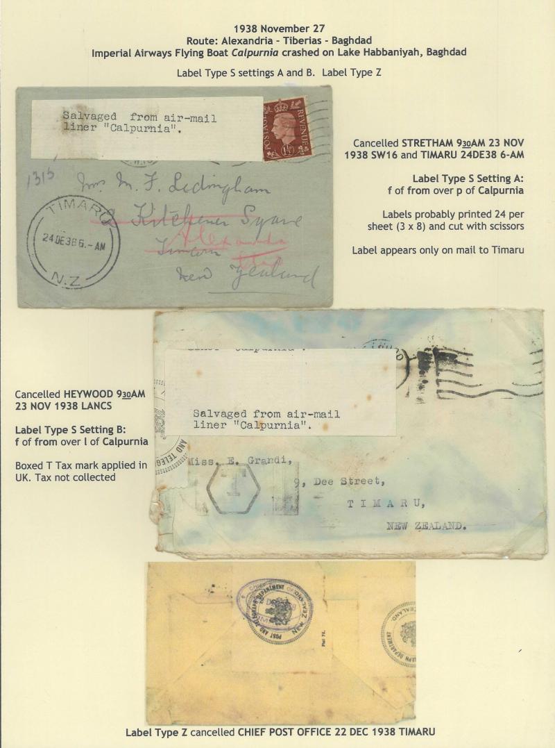 violet, light 'RECEIVED IN DAMAGED CONDITION/AT CHRISTCHURCH' in rosine, and 'Received at Christchurch/a damaged condition' ('in' omitted) in rosine, or roneo'd label 'Salvaged from air-mail/liner Calpurnia' x2 (one underpaid), most with the stamps
